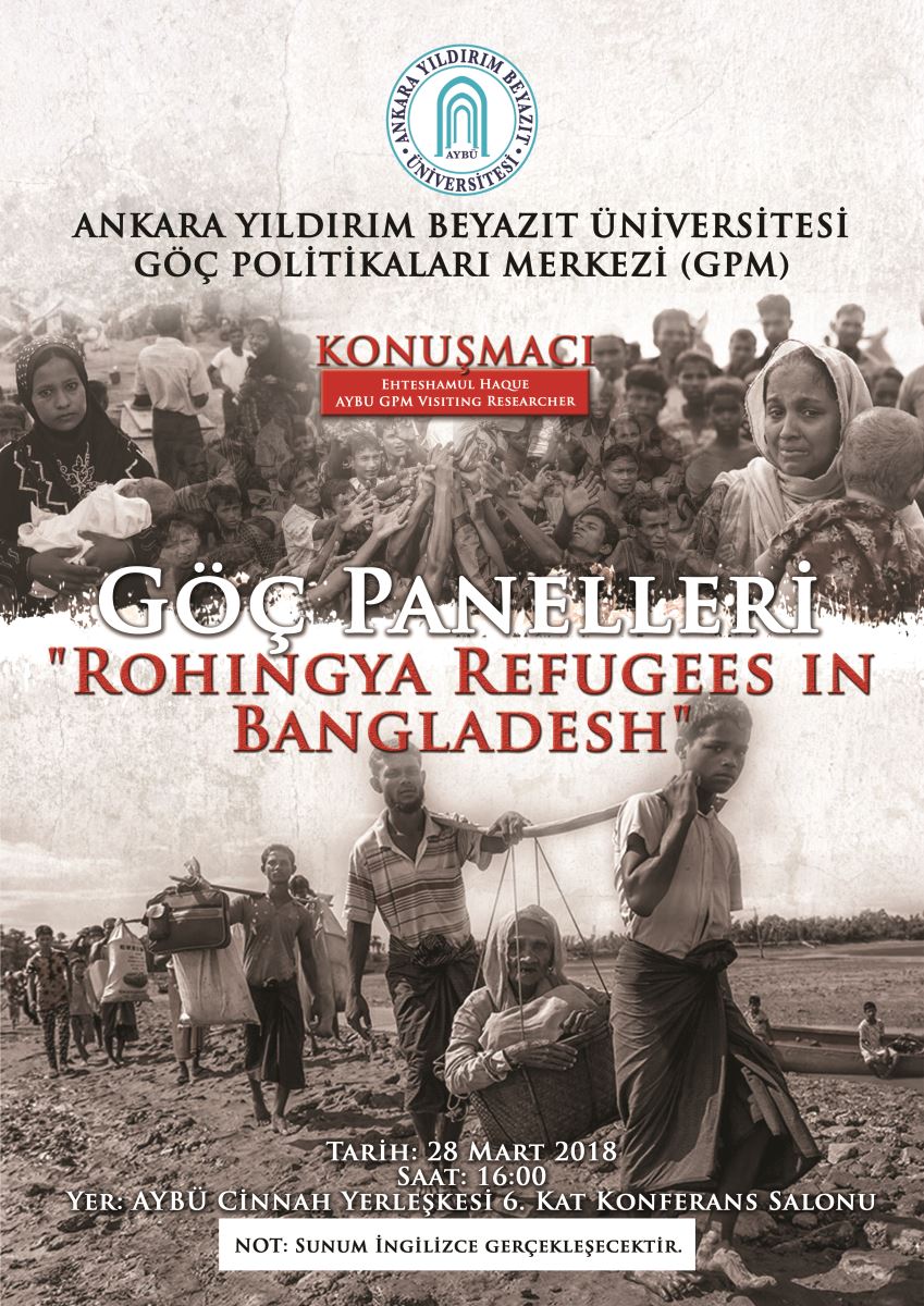 AYBÜ GPM’de Misafir Araştırmacı ve aynı zamanda Üniversitemiz Uluslararası İlişkiler Bölümünde yüksek lisans öğrencisi olan Ehteshamul Haque tarafından "Rohingya Refugees in Bangladesh" başlıklı bir konferans verilecektir. Göç Panelleri Serisi kapsamındaki bu etkinlik 28 Mart 2018 Çarşamba günü saat 16:00'da AYBÜ Cinnah Yerleşkesi 6. Kat Konferans Salonunda gerçekleşecektir. Etkinliğe tüm mensuplarımız davetlidir.