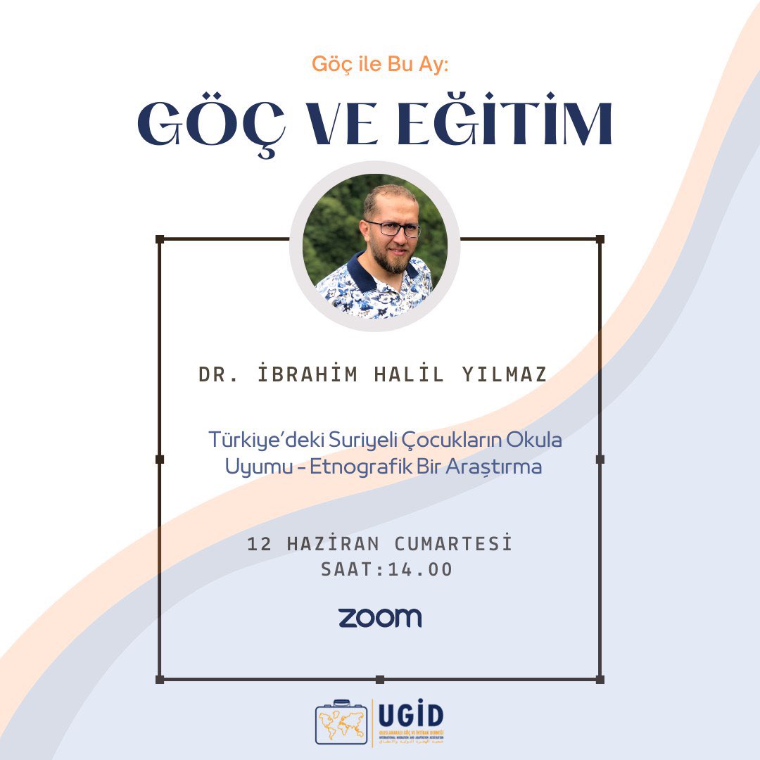 Dr. İbrahim Halil Yılmaz 12 Haziran 2021 tarihinde Uluslararası Göç ve İntibak Derneği (UGİD)'nin düzenlediği Göç ve Eğitim adlı seminer dizisinde "Türkiye’deki Suriyeli Çocukların Okula Uyumu - Etnografik Bir Araştırma" başlıklı bir konuşma yaptı.