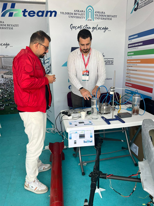 Üniversitemiz standında, H2TEAM laboratuvarında özgün olarak geliştirdiğimiz PEM Elektrolizör teknolojisi ile hidrojen üretim sürecini canlı olarak sergiledik. Ardından üretilen hidrojen, yine H2TEAM tarafından geliştirilen PEM Yakıt Pili sistemine beslenerek elektrik enerjisine dönüştürüldü.