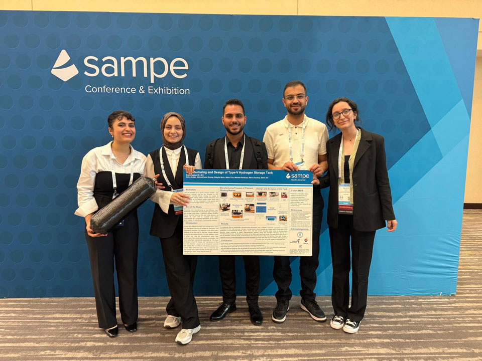 Fakültemiz Havacılık ve Uzay Mühendisliği Bölümü öğrencileri tarafından geliştirilen, tamamen yerli ve kompozit malzemeden üretilmiş Tip 5 hidrojen tankı; dünyanın önde gelen malzeme bilimi konferansları arasında yer alan SAMPE 2025’te sergilenmeye, uzay alanındaki en prestijli etkinliklerden biri olan IAC 2025’te ise sözlü sunumla temsil edilmeye hak kazandı.