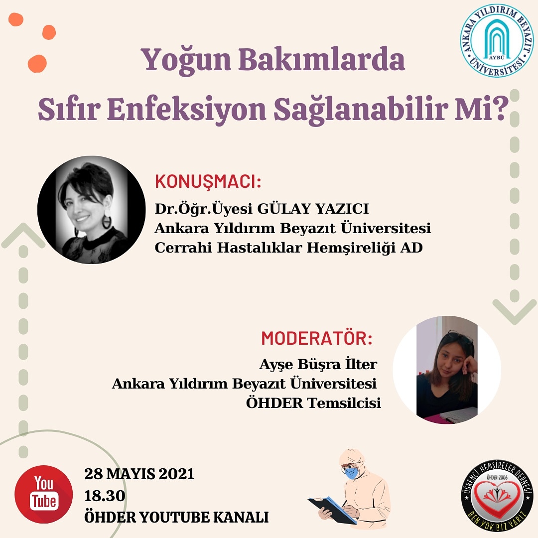 28.05.2021 tarihinde Bölüm Başkan Yardımcımız Sayın Dr. Öğr. Üyesi Gülay Yazıcı, Öğrenci Hemşireler Derneğinin düzenleyeceği 'Yoğun Bakımlarda Sıfır Enfeksiyon Sağlanabilir mi?' başlıklı söyleşi de yer alacaktır