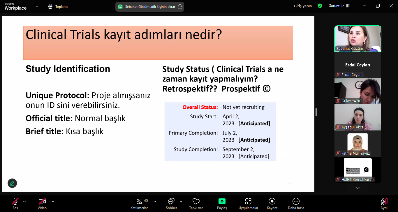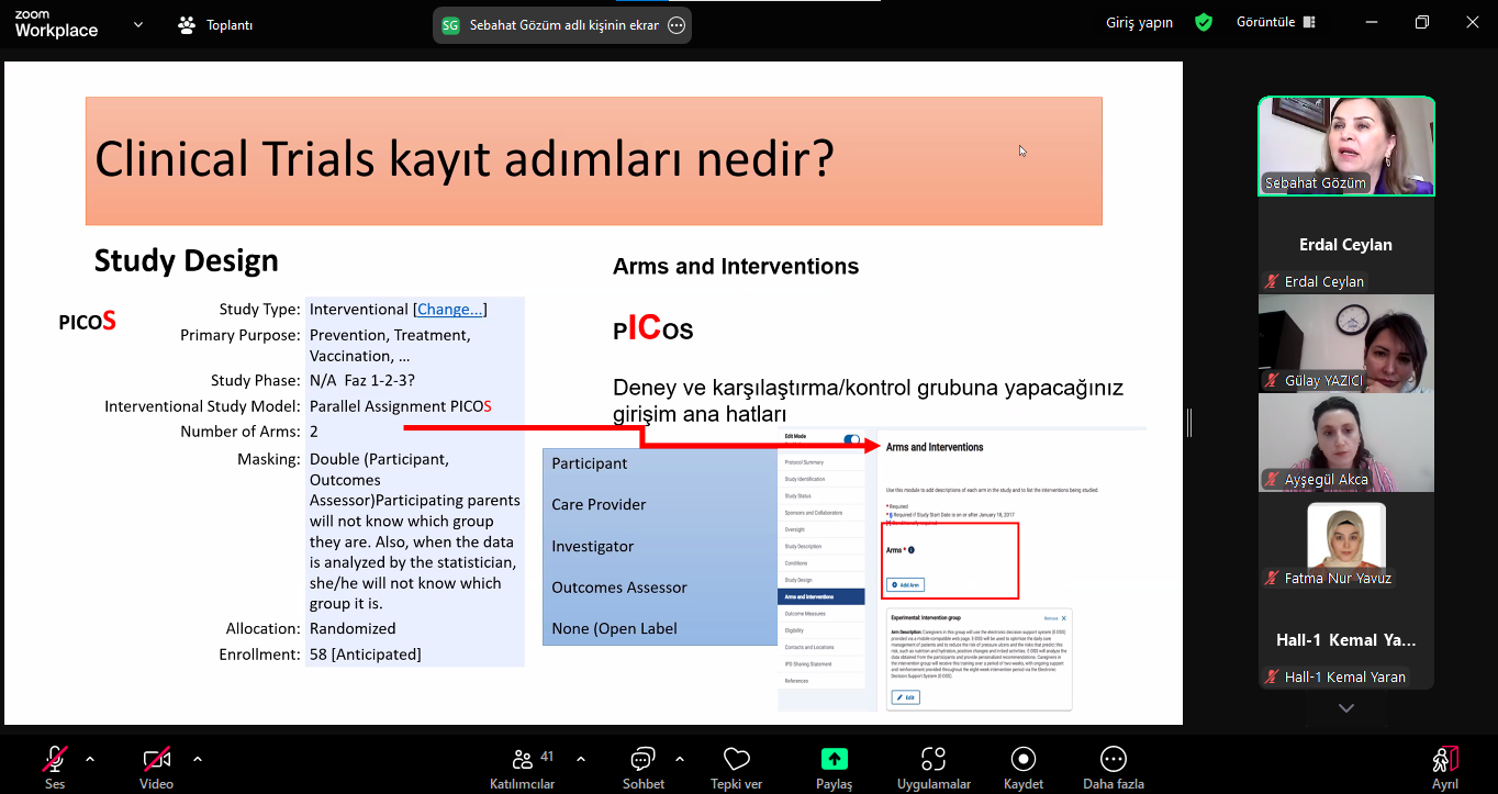 Hemşirelik Bölüm Başkanlığı tarafından Bölüm ve Fakültemizin öğretim elemanları ve lisansüstü öğrencilerimize yönelik olarak "Deneysel Çalışmalarda Protokol Kaydı: ClinicalTrial" eğitimi gerçekleştirilmiştir. Bölümümüz öğretim üyelerinden Dr. Öğr. Üyesi Ayşegül AKCA'nın moderatörlüğünde gerçekleştirilen eğitimde Akdeniz Üniversitesi Hemşirelik Fakültesi öğretim üyelerinden Prof. Dr. Sebahat Gözüm deneysel çalışmalar, randomize kontrollü çalışma türleri ve deneysel çalışmaların protokol kayıt süreci hakkında ayrıntılı bir sunum gerçekleştirmiştir. Çok sayıda öğretim elemanı ve lisansüstü öğrencimizin katılım sağladığı eğitim soru cevap ve teşekkür belgesinin takdimi ile sona ermiştir.