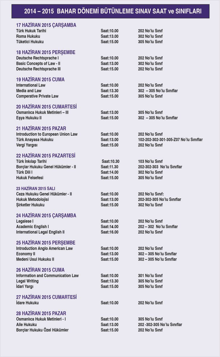 2014-2015 Bahar Dönemi Bütünleme Sınavı Saati ve Sınıfları