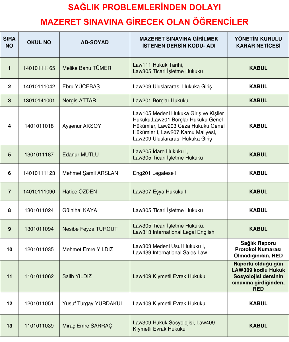 2016–2017 Güz Dönemi Mazeret Sınavı Duyurusu