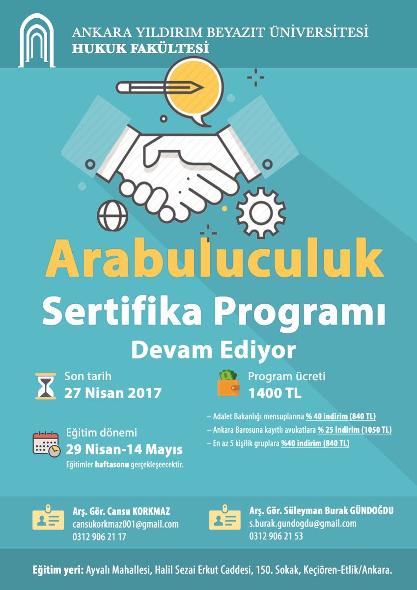 29 Nisan 2017 tarihinde başlayacak olan arabuluculuk sertifika programımız için son başvuru tarihi 27 Nisan 2017'dir.