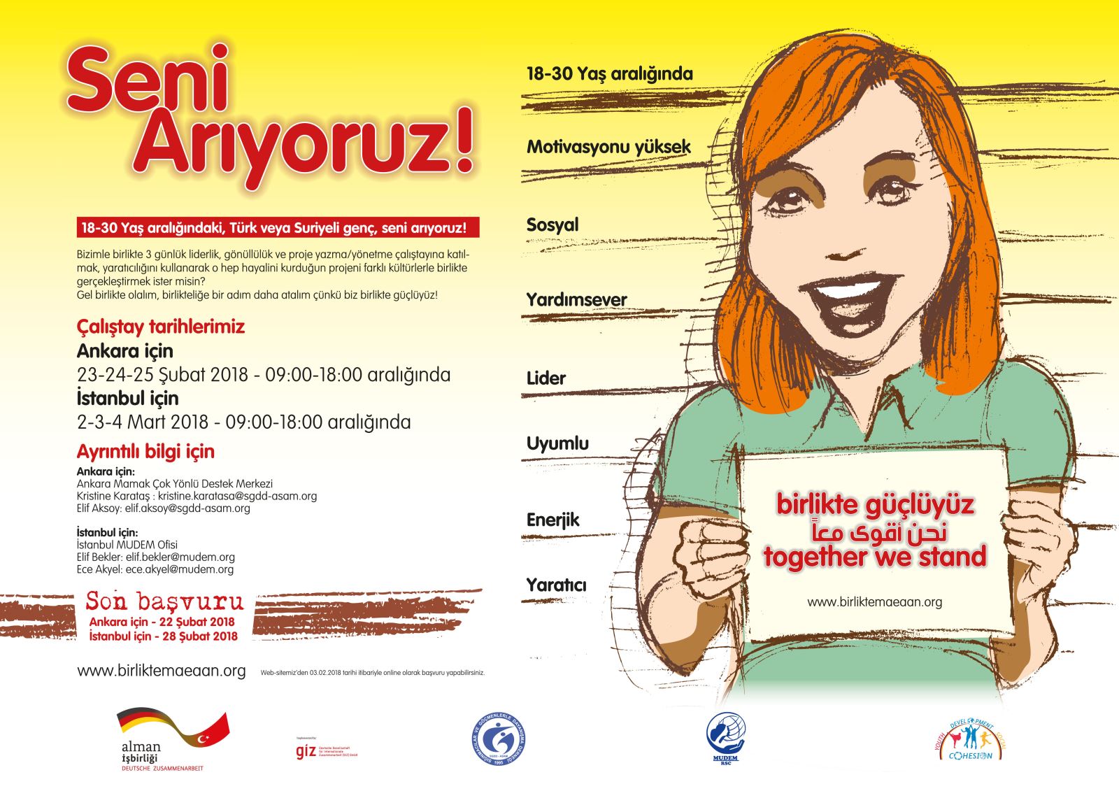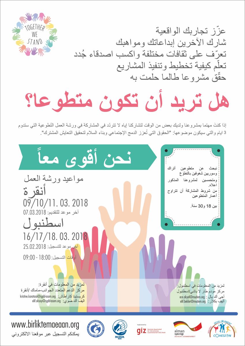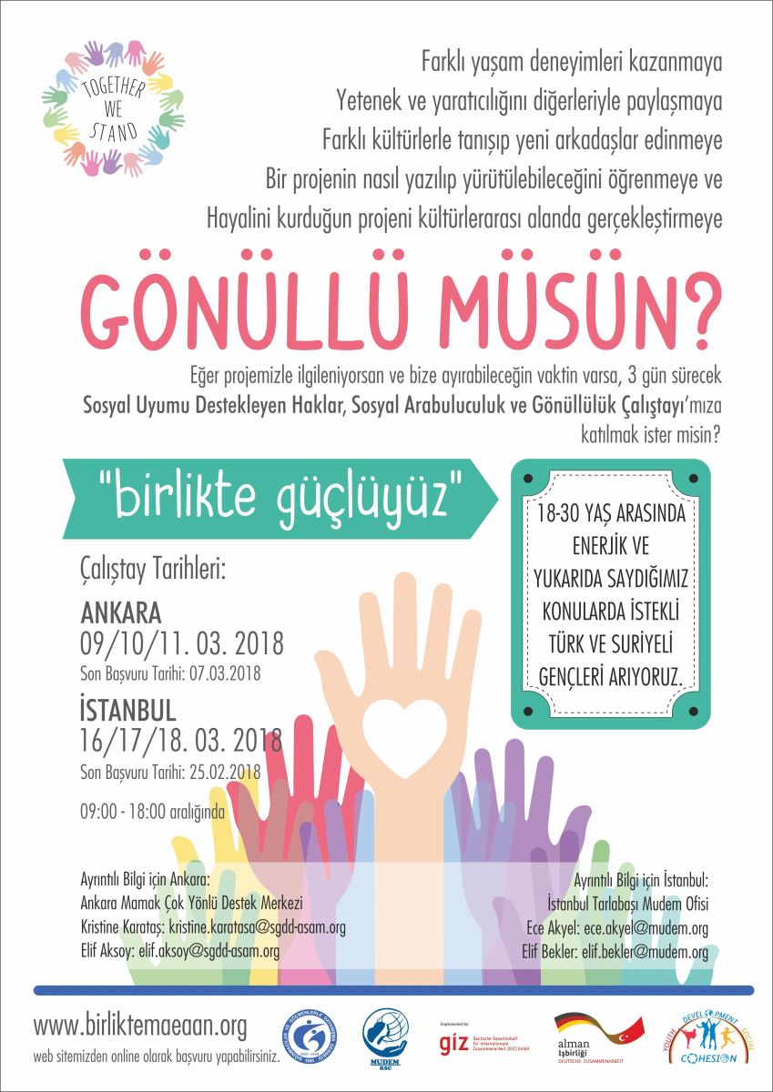 Ankara ASAM/SGDD (Sığınmacılar Ve Göçmenlerle Dayanışma Derneği) ve İstanbul MUDEM (Mülteci Destek Derneği) tarafından yürütülmekte olan “Together We Stand” Projesi kapsamında; Türk ve Suriyeli gençlerin, Türk ve Suriyelilerin entegrasyonu, işbirliği, beraber yaşama ve birlikte toplumsal ve de faaliyete dayalı alanları paylaşmalarına imkan sağlayacak projelerini hayata geçirmek isteyen gönüllü öğrenciler aranmaktadır. Proje kapsamında 18-30 yaş arasındaki Suriyeli ve Türk gençlere gönüllülük ve de proje yürütme, etkinlik düzenleme konularında çalıştaylar düzenlenecek ve çalıştaylar sonunda katılımcı gönüllülerden Suriyeli ve Türk topluluklarını bir araya getirecek sanat, spor, kültür ve sosyal alanlarda projelerini hayata geçirme olanacağı verilecektir. Motivasyonu yüksek, gönüllülük temelli çalışmak isteyen, liderlik özelliğini geliştirmek isteyen ve proje gerçekleştirmek için destek ve fon arayan sorumluluk sahibi Suriyeli ve Türk gençler www.birliktemaeaan.org adresi üzerinden başvurularını yapabilirler.