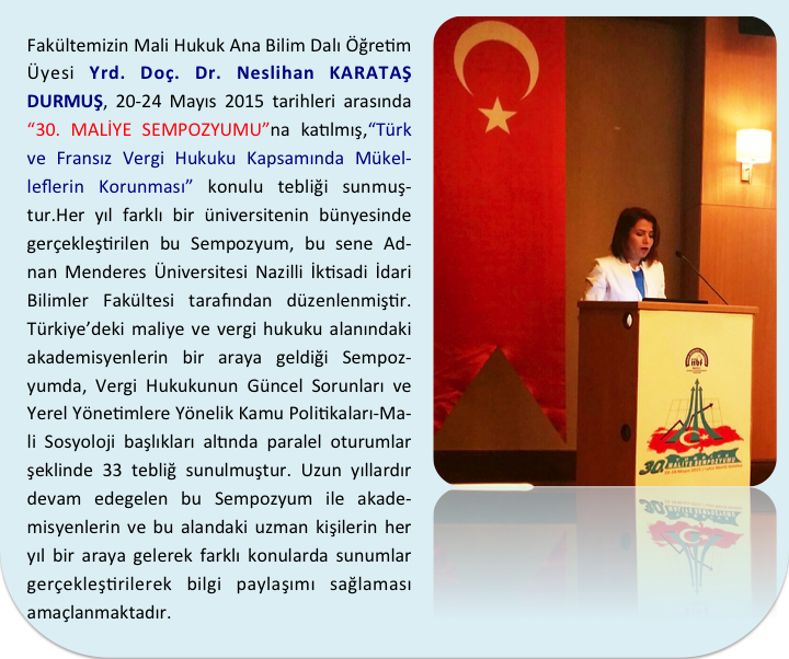 YBÜ Hukuk Fakültesi Mali Hukuk Ana Bilim Dalı Öğretim Üyesi Yrd. Doç. Dr. Neslihan KARATAŞ DURMUŞ, 20-24 Mayıs 2015 tarihleri arasında 30. MALİYE SEMPOZYUMU’nda sunum gerçekleştirmiştir.