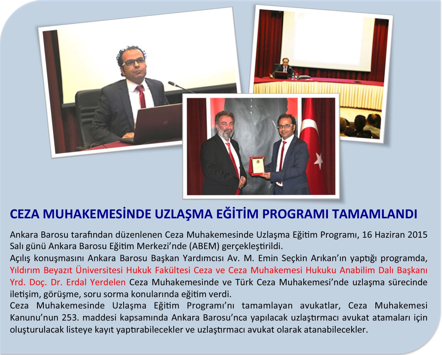 YBÜ Hukuk Fakültesi Ceza ve Ceza Muhakemesi Hukuku Anabilim Dalı Başkanı Erdal Yerdelen Ceza Muhakemesinde Uzlaşma Eğitim Programında Eğitim Verdi.