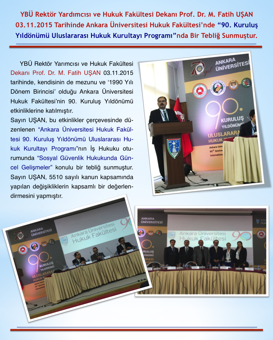 YBÜ Hukuk Fakültesi Dekanı Prof. Dr. M. Fatih UŞAN Ankara Üniversitesi Hukuk Fakültesi'nde 90. Kuruluş Yıldönümü Uluslararası Hukuk Kurultayı Programı'nda Bir Tebliğ Sunmuştur.