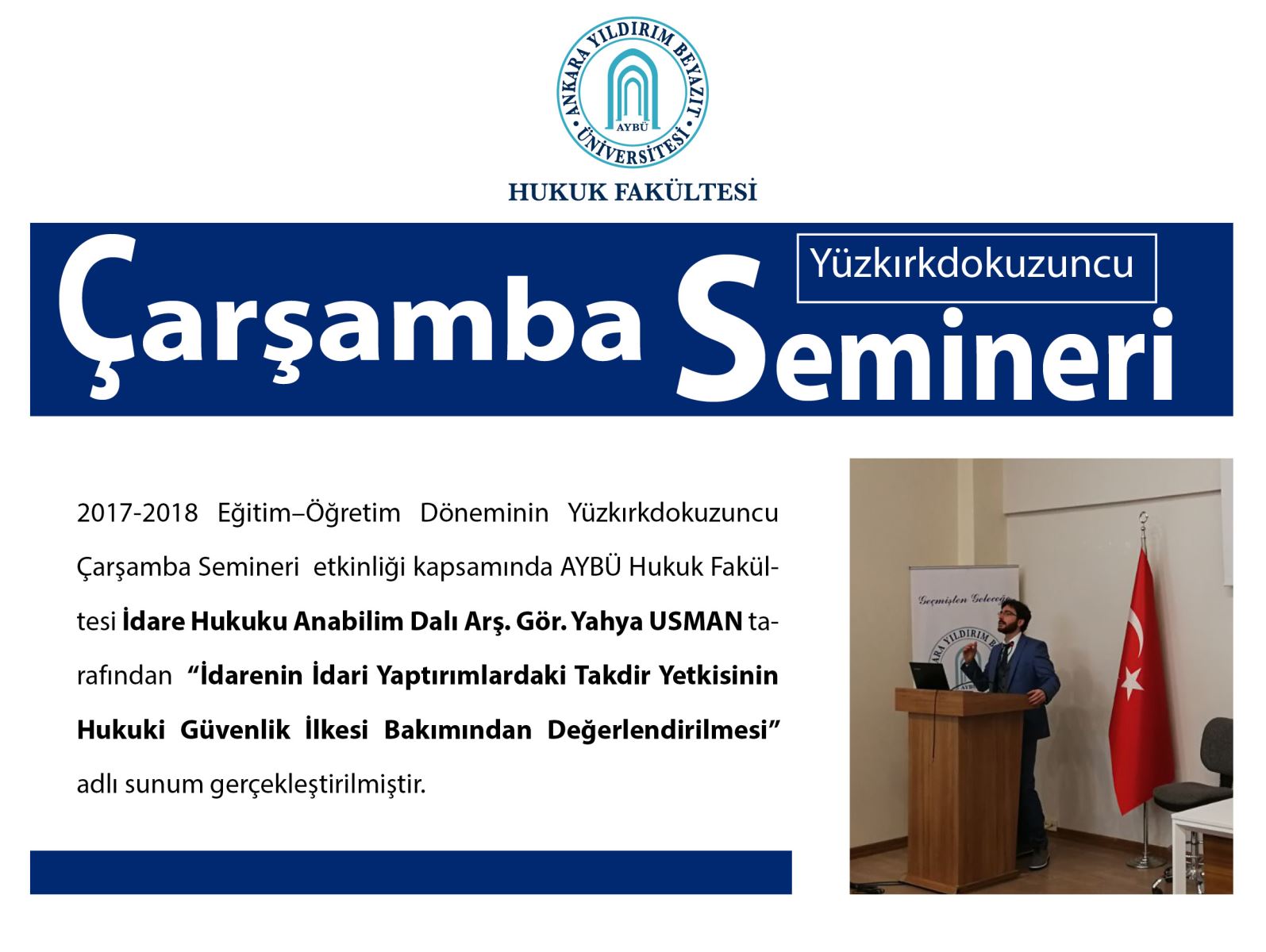 AYBÜ Hukuk Fakültesi Çarşamba Semineri 149 – İdarenin İdari Yaptırımlardaki Takdir Yetkisinin Hukuki Güvenlik İlkesi Bakımından Değerlendirilmesi Adlı Sunum Gerçekleştirildi.