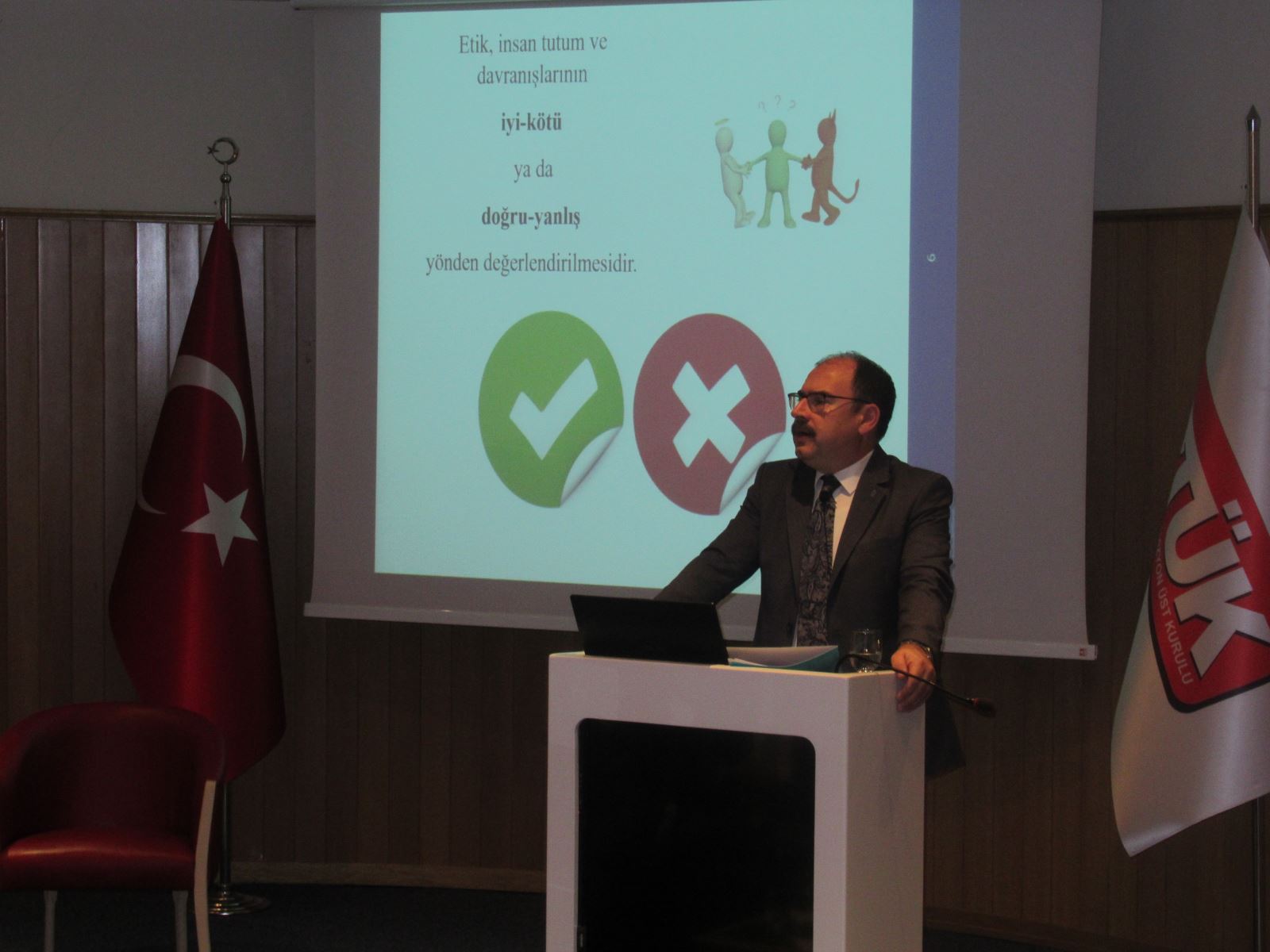 Fakültemiz Dekanı ve aynı zamanda Kamu Görevlileri Etik Kurulu üyesi olan Prof. Dr. M. Fatih UŞAN, Radyo ve Televizyon Üst Kurulu’nda “Kamuda Etik” konulu bir konferans vermiştir. Konferans, RTÜK’ün II. Eğitim ve Vizyon Günleri (4 Kasım-13 Kasım) kapsamında uzman yardımcılarına yönelik yapılan eğitimin bir parçası olarak 18 Kasım 2019 günü RTÜK Konferans salonunda düzenlenmiştir. Dekanımız sunumunda genel olarak etik kavramı üzerinde durmuş, kamuda etik uygulamaları ve Kamu Görevlileri Etik Kurulunun faaliyetleri hakkında bilgi vermiş, akabinde konu ile ilgili soruları da cevaplamıştır.