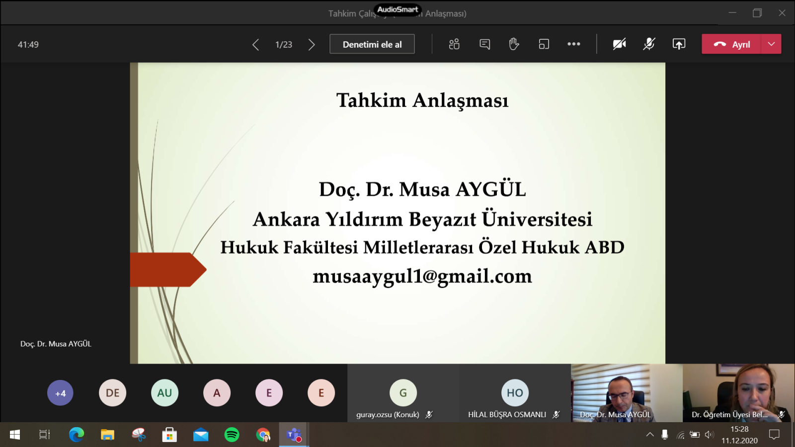 T.C. Cumhurbaşkanlığı İdarî İşler Başkanlığı Hukuk ve Mevzuat Genel Müdürlüğü Uluslararası Tahkim ve Alternatif Çözümler Daire Başkanlığı ile Ankara Yıldırım Beyazıt Üniversitesi Hukuk Fakültesi Milletlerarası Özel Hukuk ABD arasında “Tahkim Anlaşması” konulu bir çalıştay 11.12.2020 tarihinde saat 15:00’te Microsoft Teams üzerinden gerçekleştirilmiştir.