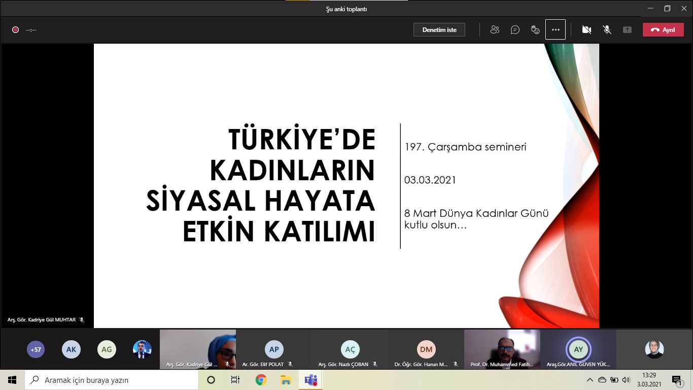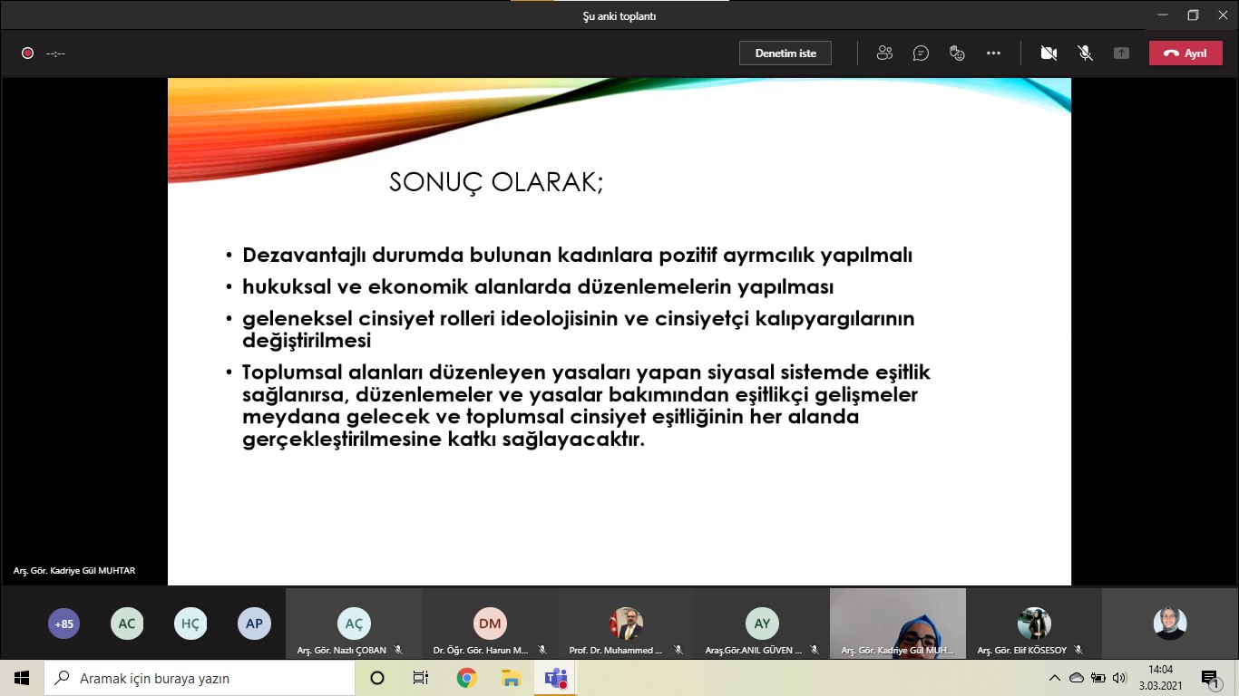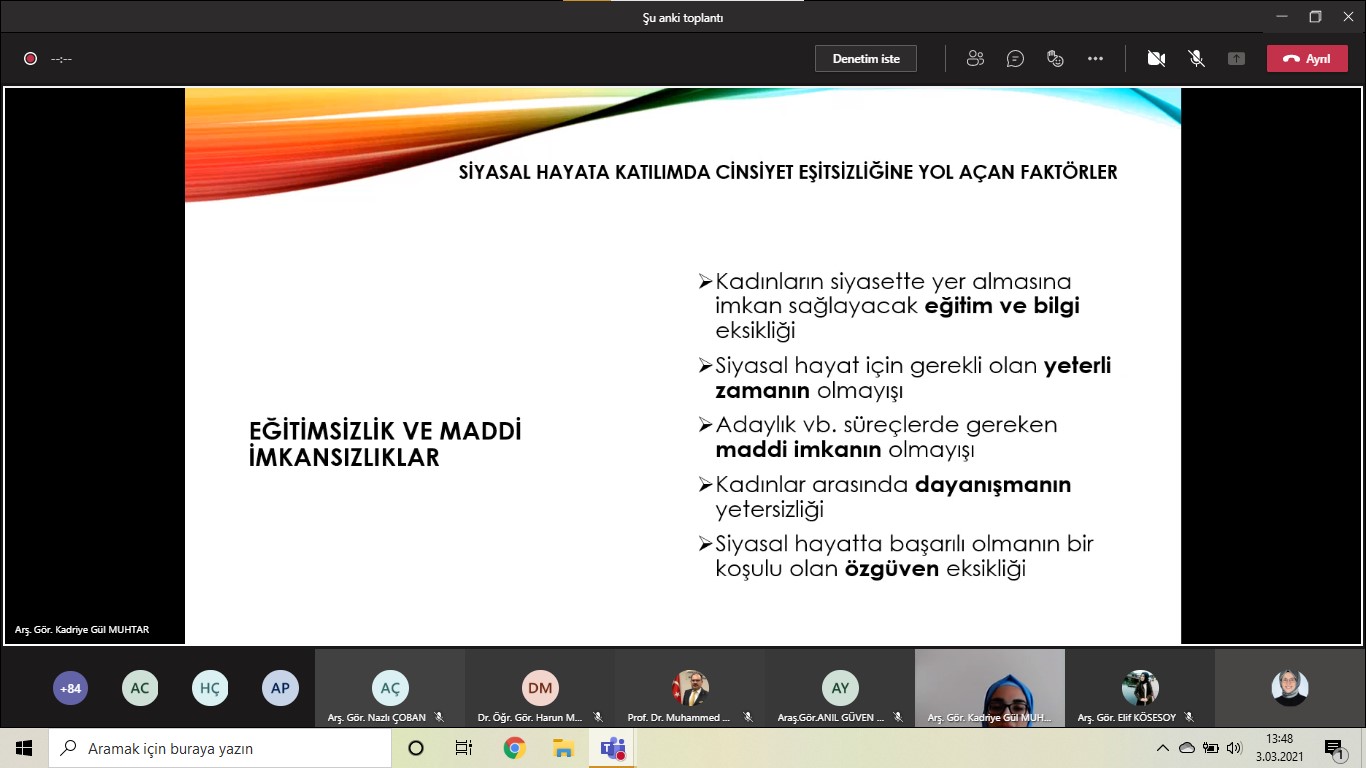 Arş. Gör. Kadriye Gül GÜNGÖR, sunumunda öncelikle konunun önemi hakkında bilgi vermiştir. Akabinde, Türkiye'de kadınların siyasal katılımı, katılım oran ve etkilerine değinilerek açıklanmıştır. Son olarak, siyasal katılımda cinsiyet eşitsizliğine yol açan faktörler, sivil toplum örgütlerinin siyasal katılımdaki önemi ve etkin katılımı artırmaya yönelik bazı yöntemler ele alınmıştır.