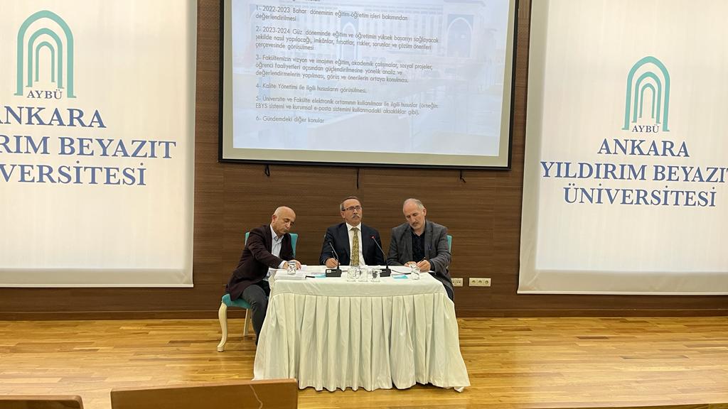 Fakültemiz, 23.06.2023 tarihinde 2022-2023 Eğitim Öğretim yılı Bahar Dönemi Akademik Genel Kurul Toplantısını gerçekleştirdi. Toplantı Dekan Prof.Dr.Murat DEMİRKOL'un açılış konuşmasıyla başladı. Toplantıda Dekan yardımcıları Doç.Dr.İlyas CANİKLİ ve Dr.Öğr.Üyesi Servet DEMİRBAŞ Fakültenin genel durumu hakkında bilgilendirme yaptılar. Bölüm Başkanları dönem değerlendirmelerinde bulundular. Fakültemize akademik çalışmalarıyla katkı sunan öğretim üyelerine teşekkür plaketlerini önceki dönem Dekanlık görevini yürüten Prof.Dr.Mehmet ÜNAL takdim etti.