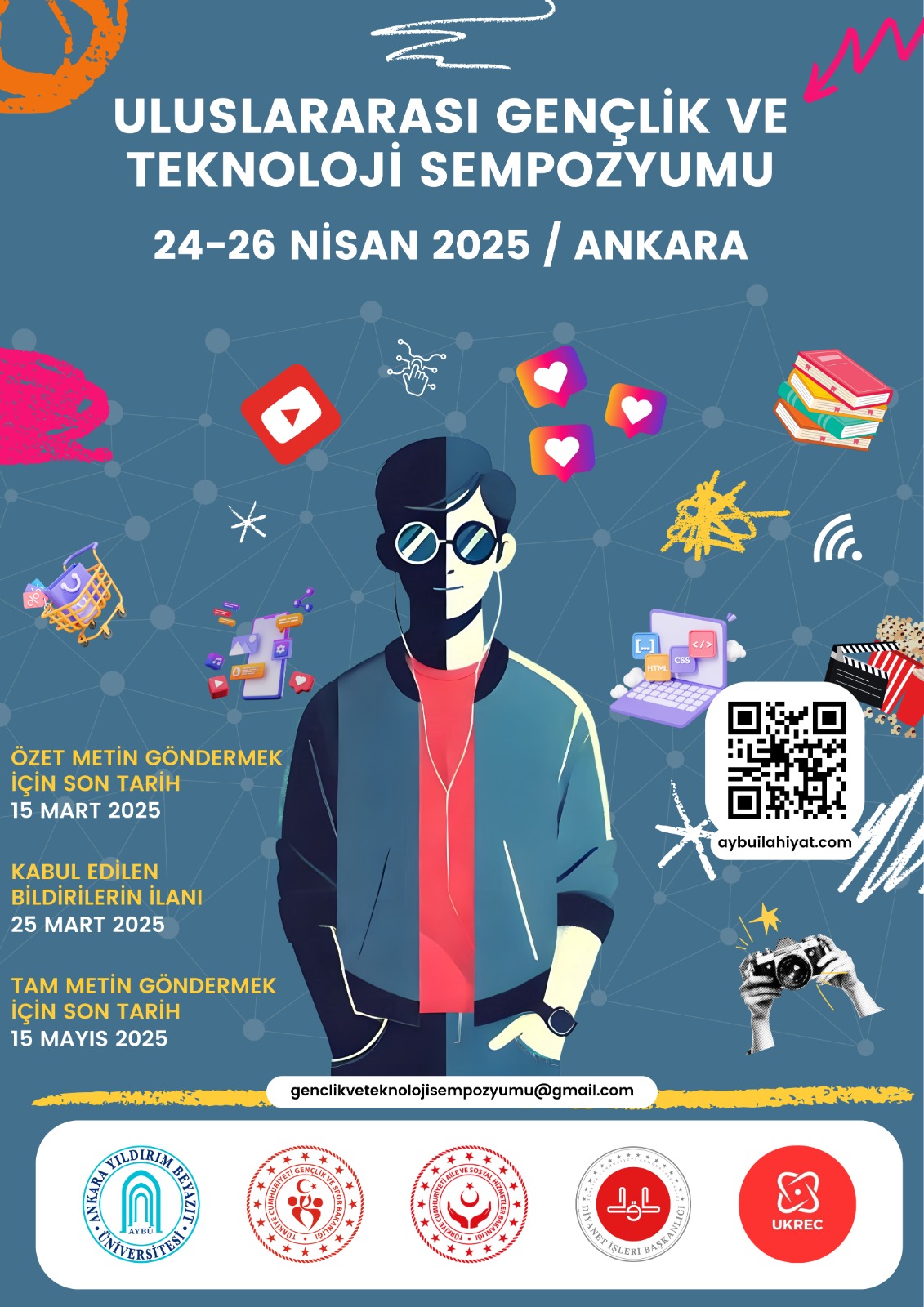 Gençlik ve Spor Bakanlığı, Aile ve Sosyal Hizmetler Bakanlığı ve Diyanet İşleri Başkanlığının destekleri ile üniversitemiz İlahiyat Fakültesi ev sahipliğinde 24-26 Nisan 205 tarihleri arasında “Gençlik ve Teknoloji” başlıklı uluslararası bir sempozyum düzenlenecektir. Sempozyuma aybuilahiyat.com adresi üzerinden başvuru yapabilirsiniz.