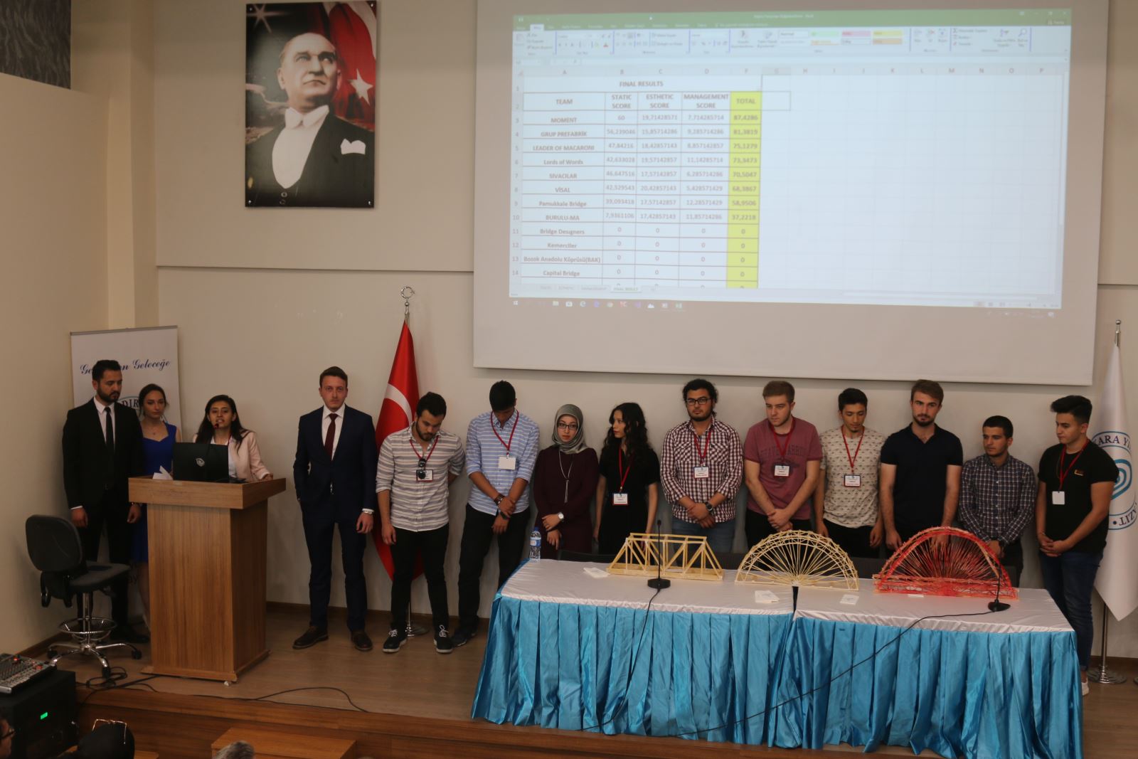 Ankara Yıldırım Beyazıt Üniversitesi Yapı Topluluğu tarafından bu sene ilki düzenlenen Yıldırım Köprü Tasarım ve Modelleme Yarışması'nda 17 farklı üniversiteden 22 takım ön elemeyi geçerek yarışmaya katılmaya hak kazandı. Yarışma öncesinde çeşitli üniversitelerden gelen yarışmacılar Ankara’yı gezdiler. 15 Temmuz Şehitleri Binamızda gerçekleştirilen yarışmada ikinci aşamaya geçen takımlar 7 saatlik süre zarfı içinde malzemesi spagetti olan köprü tasarımlarını bitirdiler. Jüriler tarafından statik, estetik ve takım çalışmasına yönelik puanlandırmalar ile birlikte kazanan takımlar belli oldu. Ankara İvedik OSB'nin de katkılarıyla gerçekleşen yarışmamız, Mühendislik ve Doğa Bilimleri Fakültesi Dekanı Prof. Dr. Veli Çelik, sponsor firma yöneticileri, öğretim üyeleri ve öğrencilerin katıldığı ödül töreni ile sona erdi.