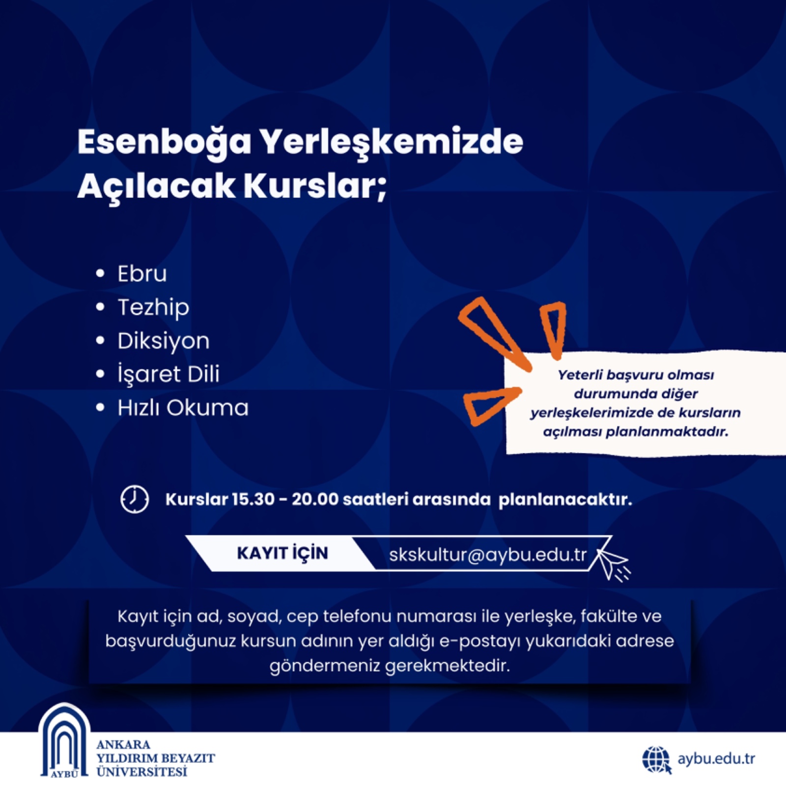 ✉️ Kayıt olmak için adınız, soyadınız, cep telefonu numaranız, yerleşke, fakülte bilgileriniz ve başvurmak istediğiniz kurs adıyla birlikte skskultur@aybu.edu.tr adresine e-posta göndermeniz yeterli!