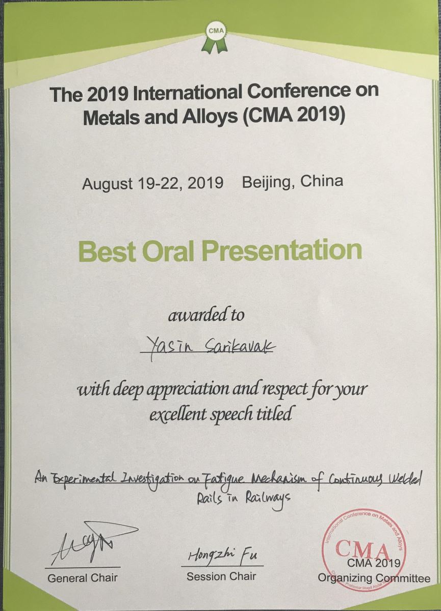 Hocamız Dr. Öğr. Üyesi Yasin SARIKAVAK Çin'in Pekin şehrinde düzenlenen "The 2019 International Conference on Metals and Alloys (CMA 2019)" başlıklı konferansta verilen en iyi sözlü sunum ödülünü kazanmıştır.
