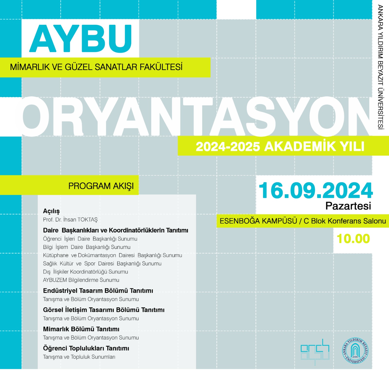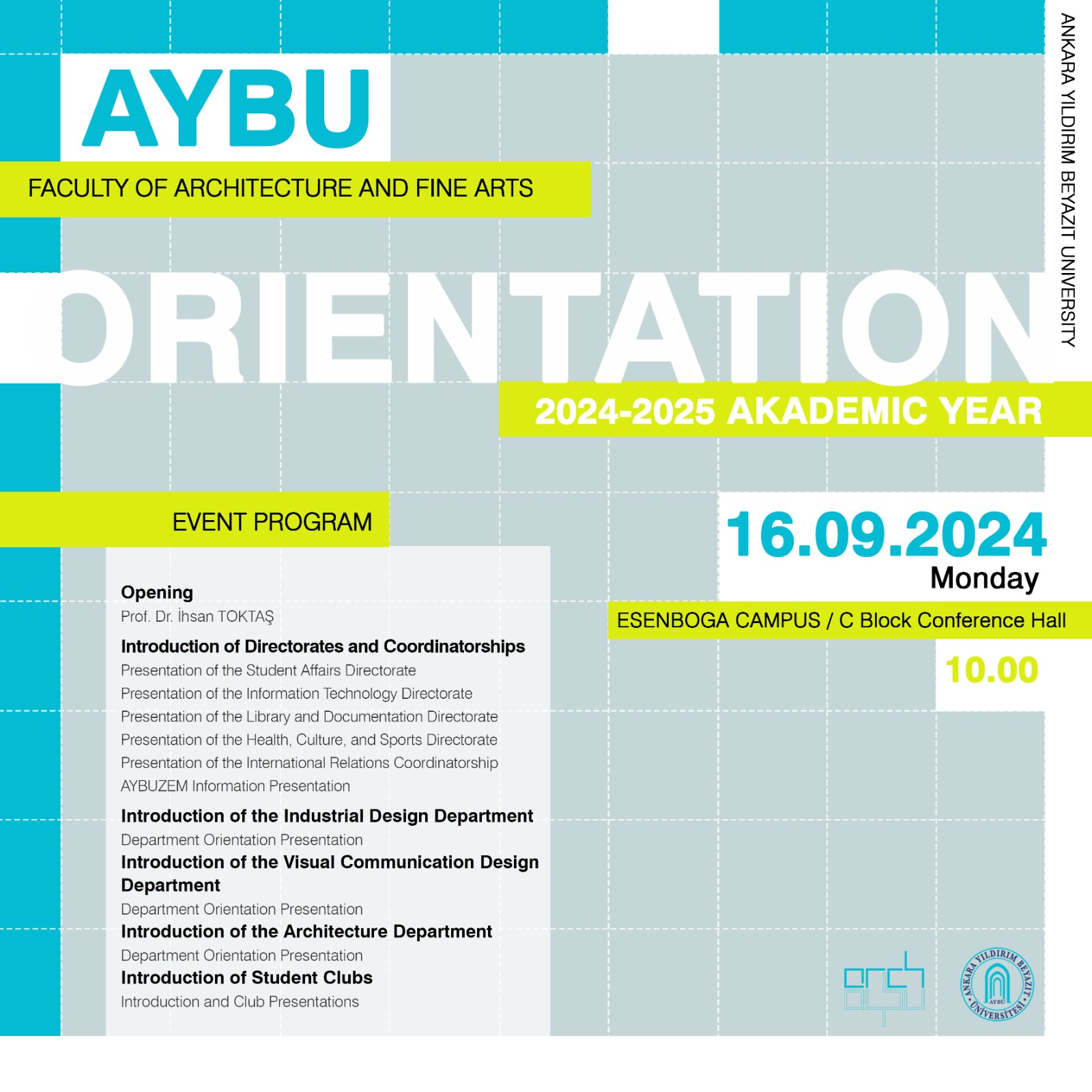 Ankara Yıldırım Beyazıt Üniversitesi (AYBU) Mimarlık ve Güzel Sanatlar Fakültesi'nin 2024-2025 Akademik Yılı Oryantasyon Programı, 16 Eylül 2024 Pazartesi günü saat 10.00'da Esenboğa Kampüsü C Blok Konferans Salonu'nda gerçekleştirilecektir.