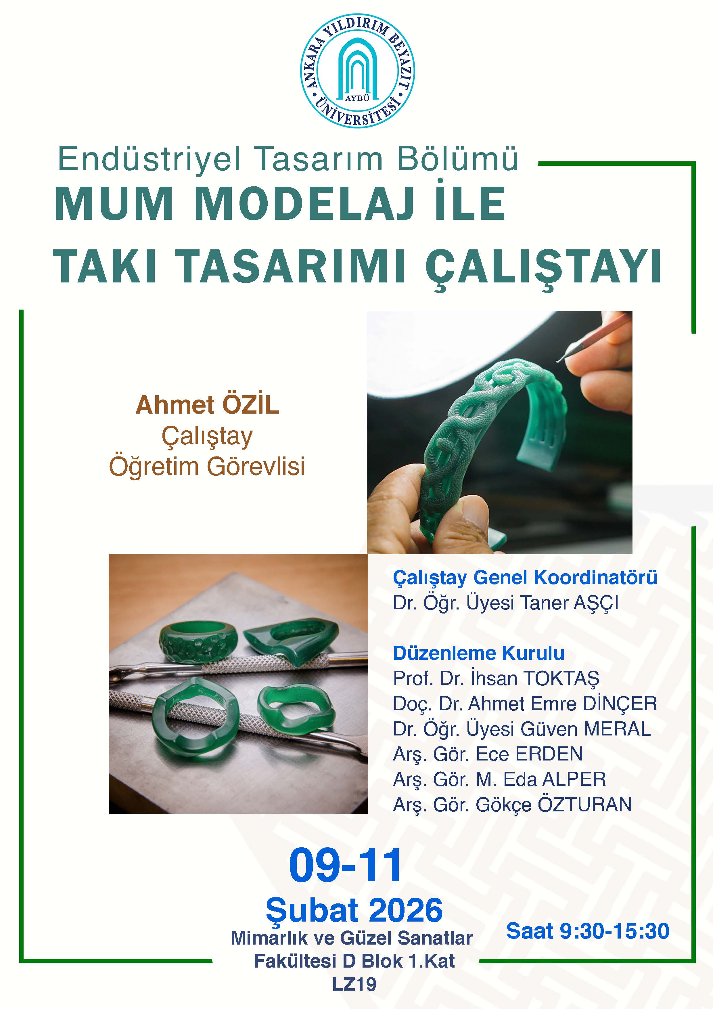 Organized by the Department of Industrial Design, Faculty of Architecture and Fine Arts, Ankara Yıldırım Beyazıt University, the “Wax Modeling Workshop for Jewelry Design” will be held on February 9–11, 2026, from 09:30 to 15:30, at LZ19 (1st Floor), D Block, Faculty of Architecture and Fine Arts.