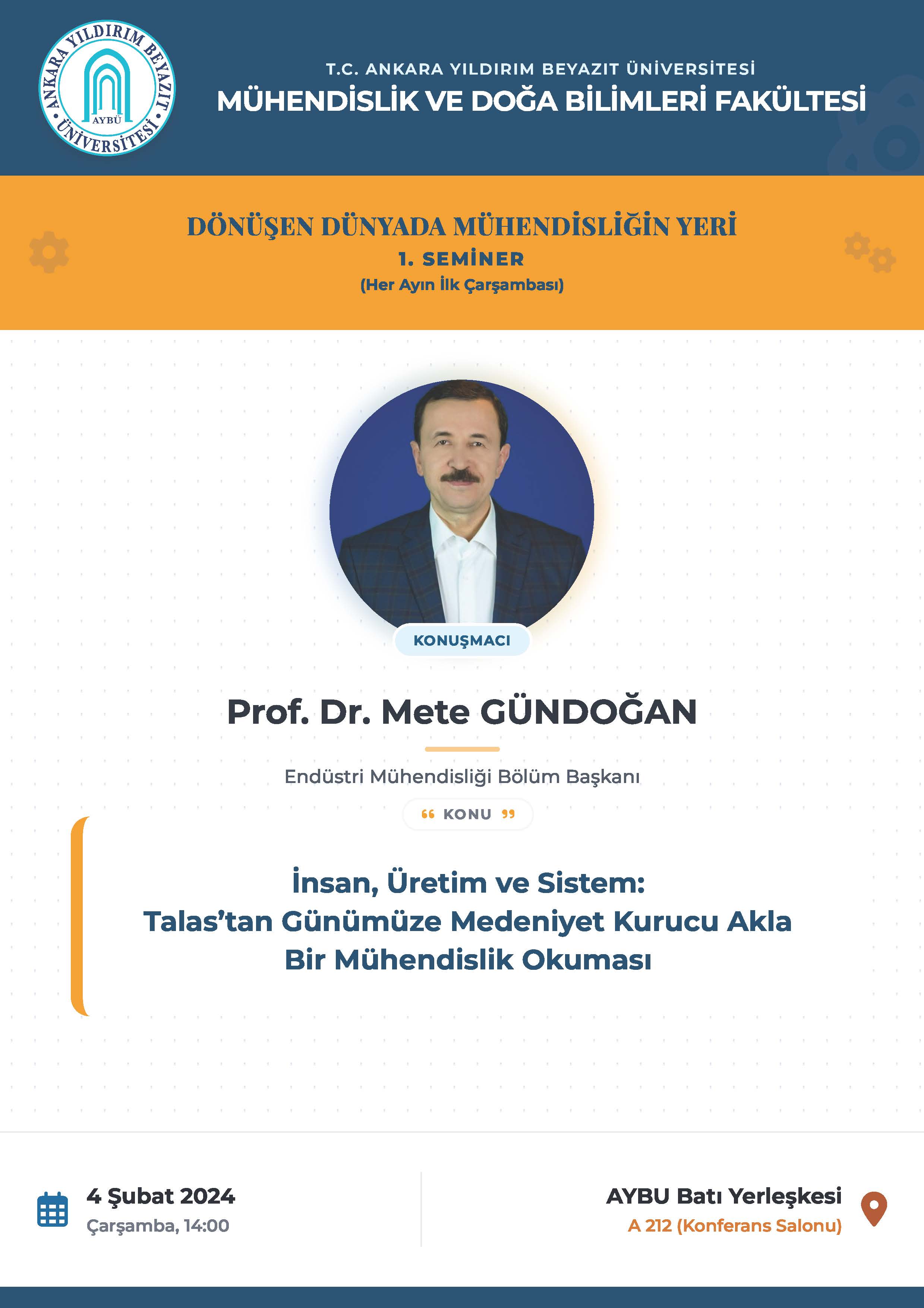 Mühendislik ve Doğa Bilimleri Fakültesi olarak, her ayın ilk çarşambası düzenli olarak gerçekleştirilecek olan “Dönüşen Dünyada Mühendisliğin Yeri” başlıklı Genel Mühendislik Seminerleri Serisinin ilk toplantısına sizleri davet etmekten memnuniyet duymaktayım.