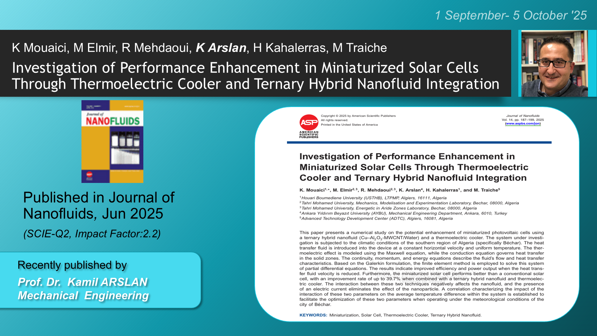 Journal of the Faculty of Engineering and Architecture of Gazi University, Cilt 40, Sayı 3, Sayfalar 1757-1769 Investigation of Performance Enhancement in Miniaturized Solar Cells Through Thermoelectric Cooler and Ternary Hybrid Nanofluid Integration K Mouaici and M Elmir and R Mehdaoui and K Arslan and H Kahalerras and M Traiche
