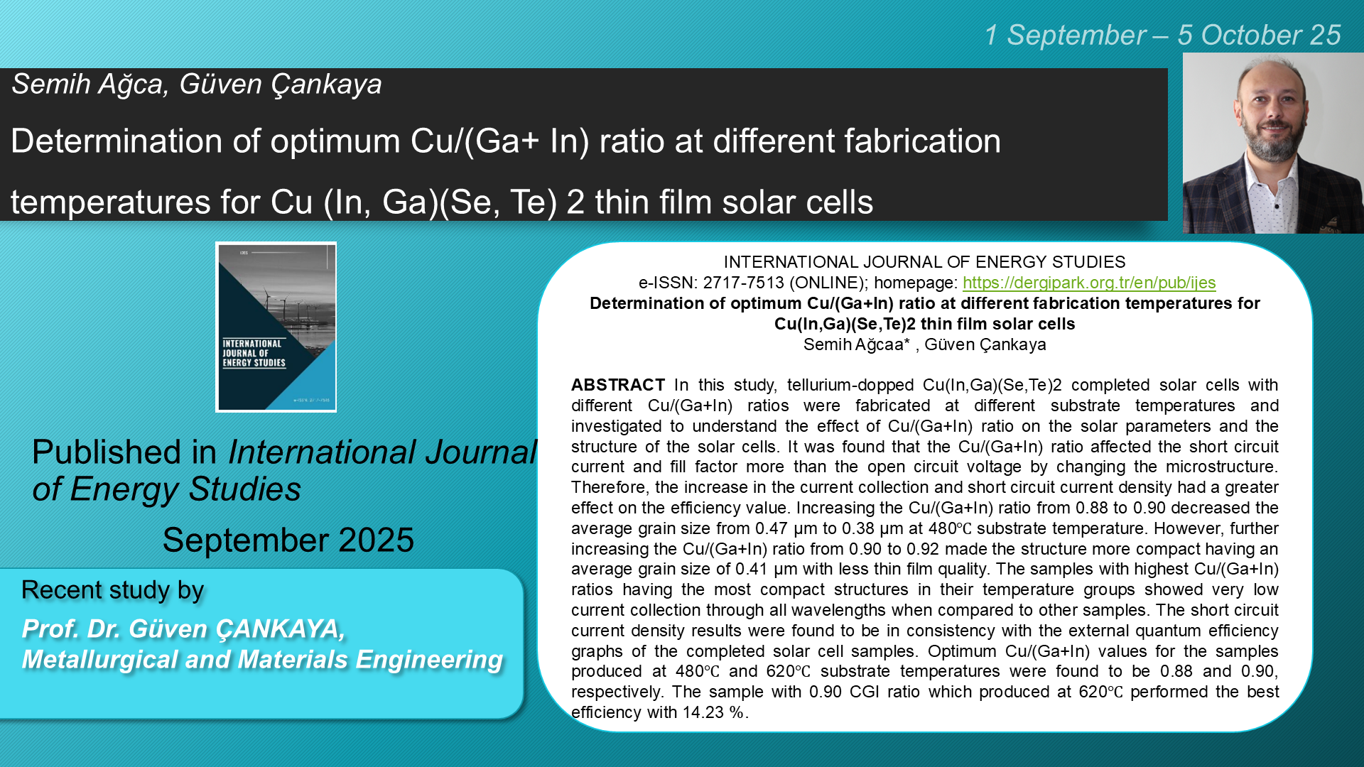 Microchemical Journal, Sayfalar 115183 Determination of optimum Cu/(Ga+ In) ratio at different fabrication temperatures for Cu (In, Ga)(Se, Te) 2 thin film solar cells Semih Ağca and Güven Çankaya