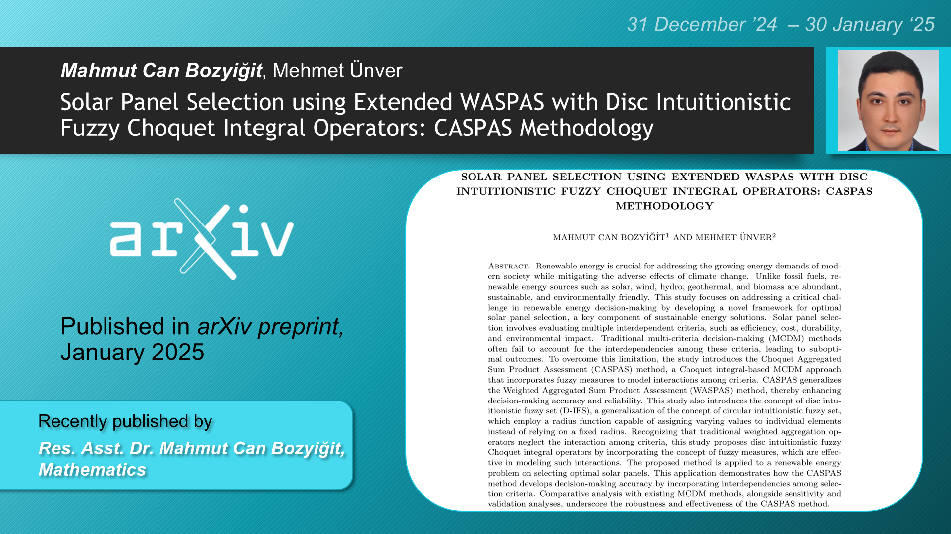PeerJ Computer Science, Cilt 11, Sayfalar e2579 Solar Panel Selection using Extended WASPAS with Disc Intuitionistic Fuzzy Choquet Integral Operators: CASPAS Methodology Mahmut Can Bozyiğit and Mehmet Ünver