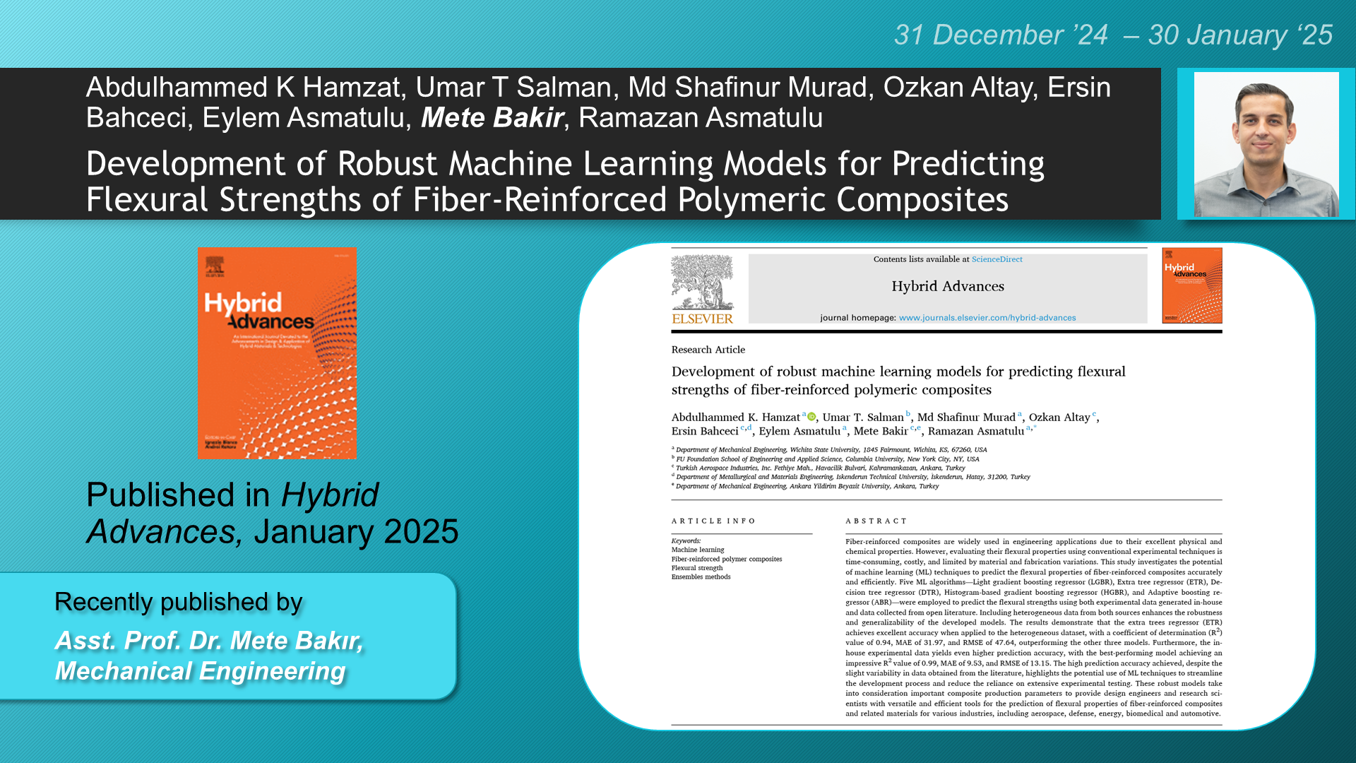 Hybrid Advances, Sayfalar 100373 Development of Robust Machine Learning Models for Predicting Flexural Strengths of Fiber-Reinforced Polymeric Composites Abdulhammed K Hamzat and Umar T Salman and Md Shafinur Murad and Ozkan Altay and Ersin Bahceci and Eylem Asmatulu and Mete Bakir and Ramazan Asmatulu