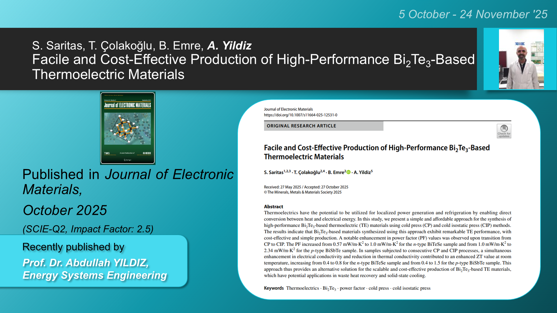 Turkish Journal of Physics, Cilt 49, Sayı 5, Sayfalar 233-243 Facile and Cost-Effective Production of High-Performance Bi2Te3-Based Thermoelectric Materials S Saritas and T Çolakoğlu and B Emre and A Yildiz