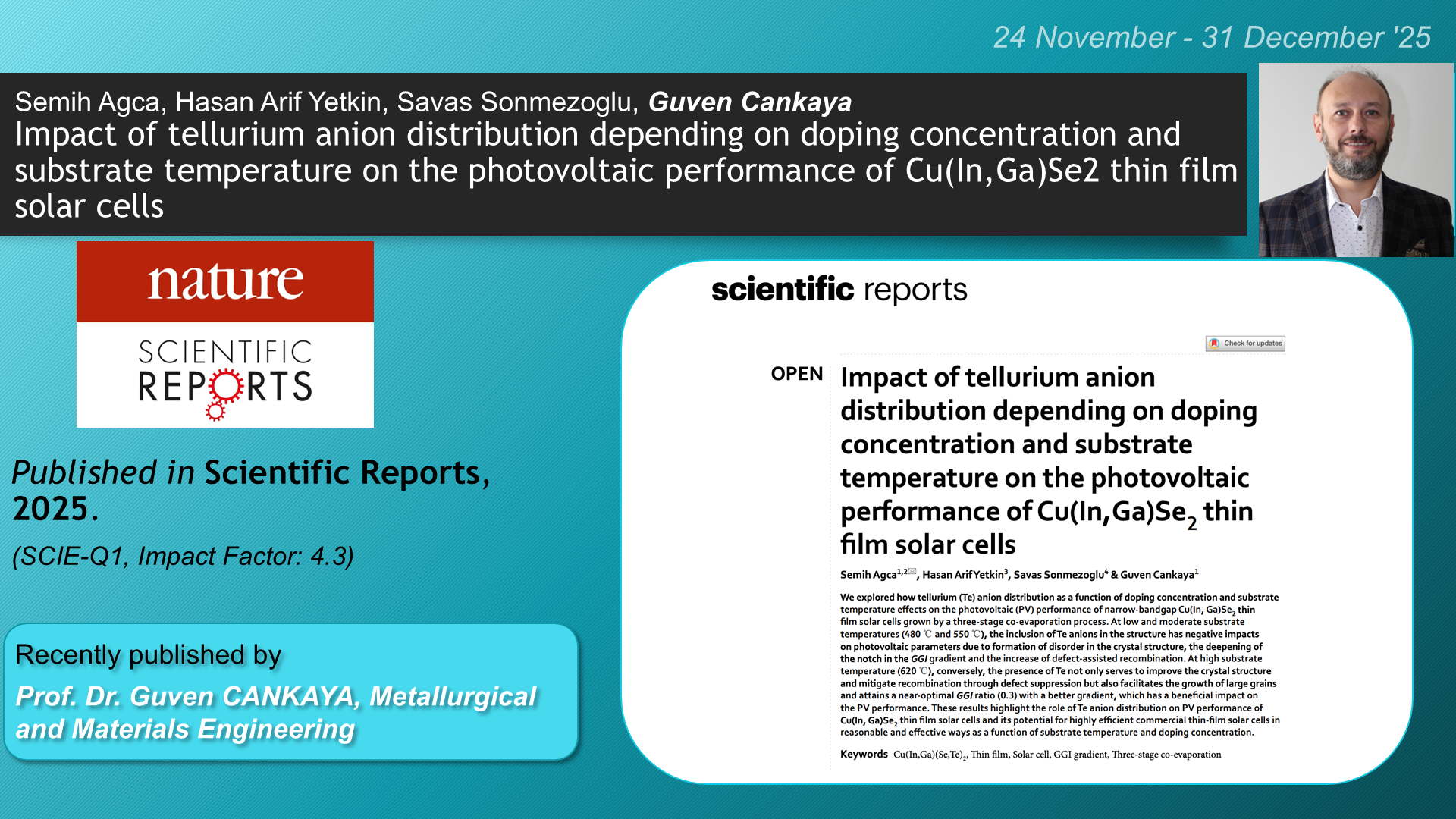 Metals, Cilt 15, Sayı 12, Sayfalar 1354 Impact of tellurium anion distribution depending on doping concentration and substrate temperature on the photovoltaic performance of Cu (In, Ga) Se2 thin film solar cells Semih Agca and Hasan Arif Yetkin and Savas Sonmezoglu and Guven Cankaya