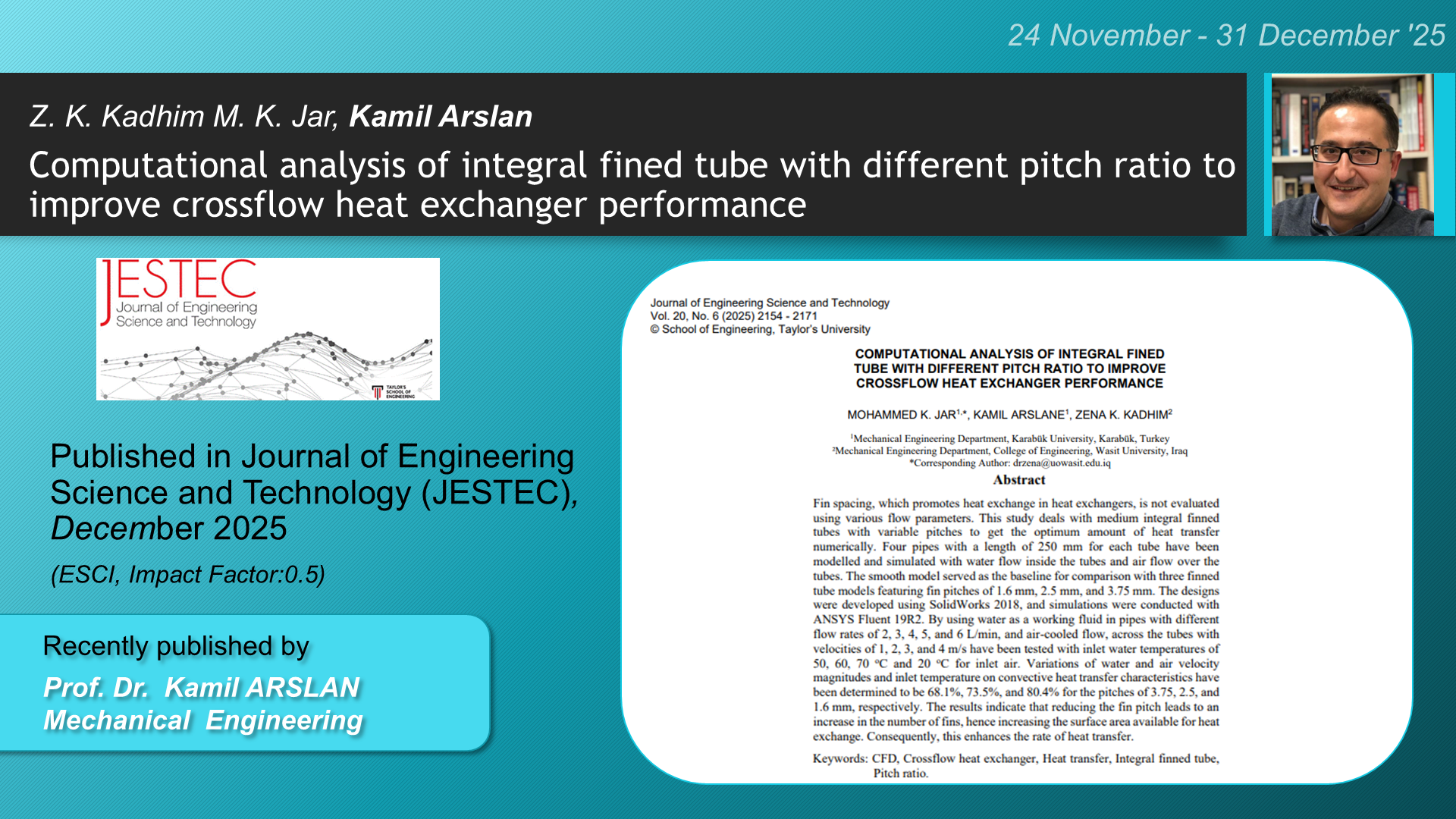 Journal of Cleaner Production, Cilt 262, Sayfalar 121424 A comprehensive review on wireless capacitive power transfer technology: Fundamentals and applications Mehmet Zahid Erel and Kamil Cagatay Bayindir and Mehmet Timur Aydemir and Sanjay K Chaudhary and Josep M Guerrero Experimental and numerical investigation of jet impingement cooling using extended jet holes Ahmet Ümit Tepe and Yaşar Yetişken and Ünal Uysal and Kamil Arslan