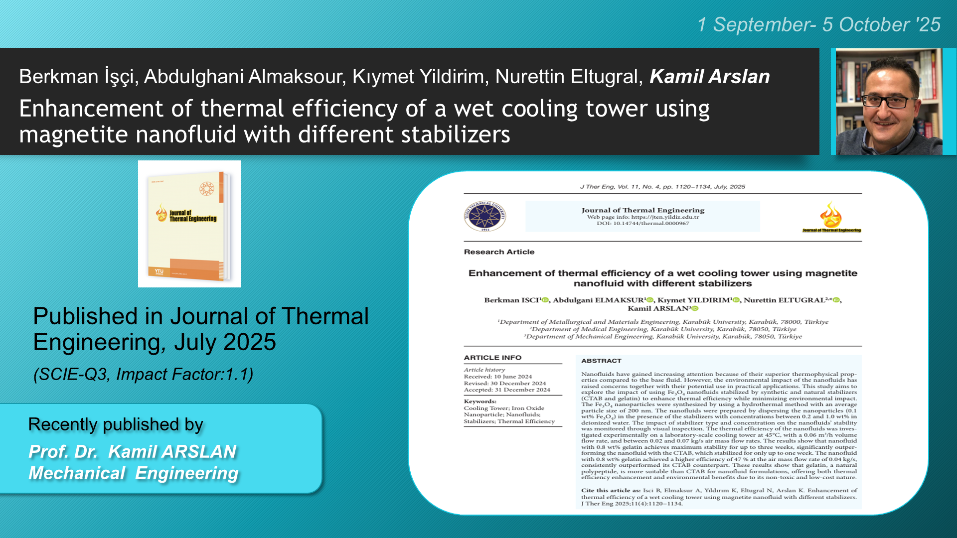 Numerical Heat Transfer, Part A: Applications, Sayfalar 1-25 Enhancement of thermal efficiency of a wet cooling tower using magnetite nanofluid with different stabilizers Berkman İşçi and Abdulghani Almaksour and Kıymet Yildirim and Nurettin Eltugral and Kamil Arslan