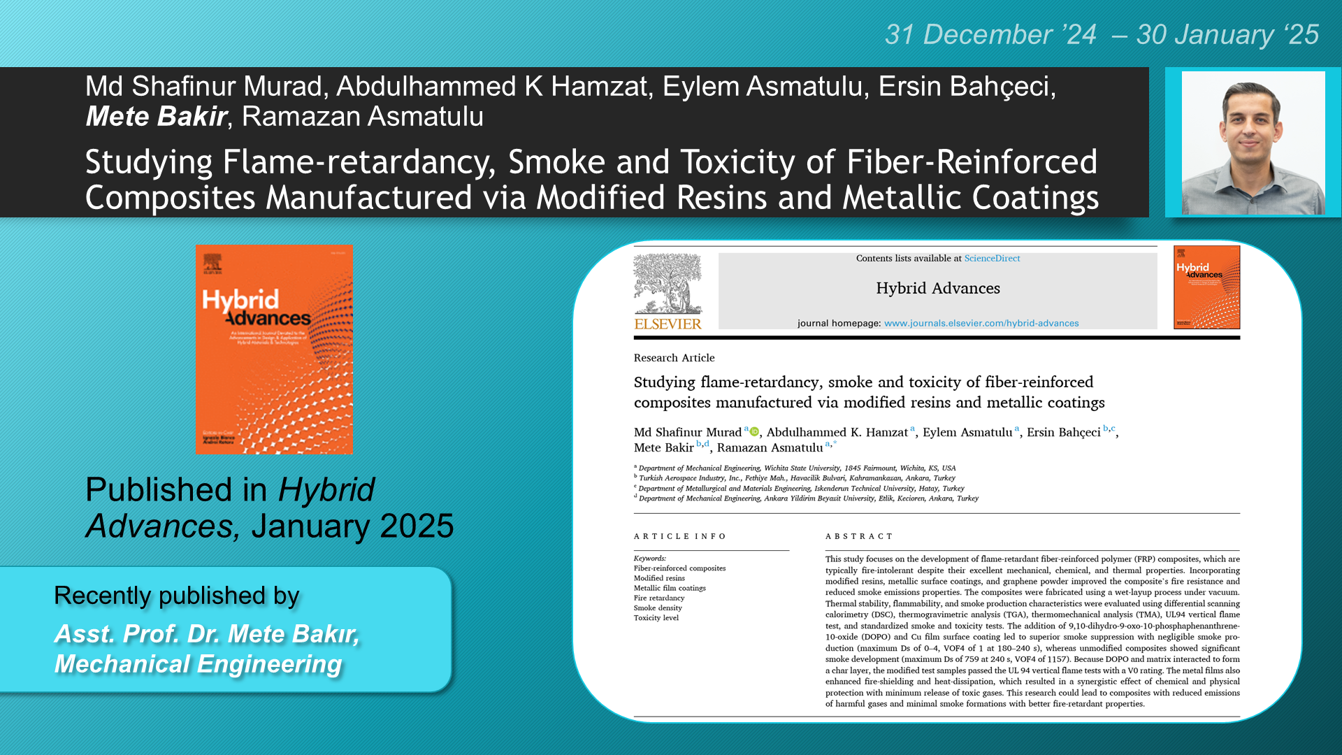 Journal of Reinforced Plastics and Composites, Sayfalar 07316844241311727 Studying Flame-retardancy, Smoke and Toxicity of Fiber-Reinforced Composites Manufactured via Modified Resins and Metallic Coatings Md Shafinur Murad and Abdulhammed K Hamzat and Eylem Asmatulu and Ersin Bahçeci and Mete Bakir and Ramazan Asmatulu