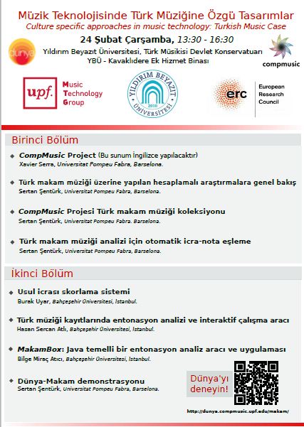 24 Şubat çarşamba günü 13.30'da Konservatuvarımızın Güneş Sokak No.11 Kavaklıdere Ankara adresinde düzenlemeyi planladığımız Müzik Teknolojisinde Türk Müziğine Özgü Tasarımlar sempozyum başlıklı çalıştay-sempozyum ile ilgili bilgiler aşağıdadır...