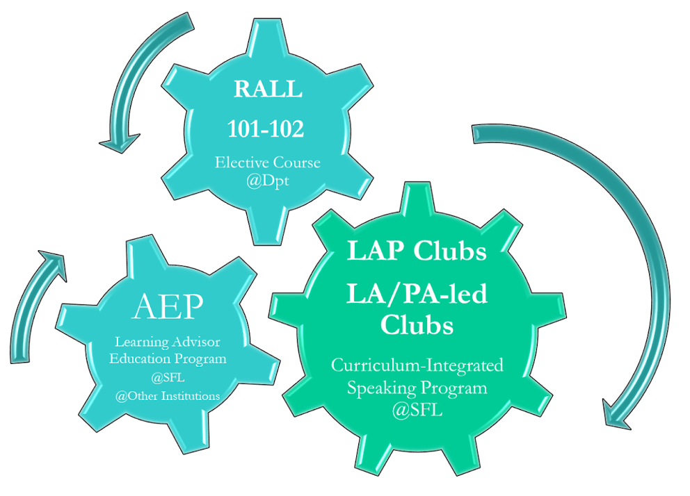 Program, AYBU'nun sosyal olarak proaktif bir öğrenme topluluğunu teşvik etmek ve liderlik becerilerini geliştirmek için tasarlanmış yapılandırılmış danışmanlık sisteminin bir parçasını oluşturmaktadır. Şekil 1, Dil Öğreniminde Danışmanlık (RALL 101-102) Seçmeli Dersi ve Danışman Eğitim Programını (AEP) entegre eden bu sistemi göstermektedir. RALL 101-102 dersleri, bölüm öğrencilerinin İngilizce öğrenme becerilerini geliştirmelerine, yüksek düzeyde aracılık ve karşılıklı katılım sağlamalarına ve danışmanlık becerilerini geliştirmelerine yardımcı olmaktadır (Güven-Yalçın ve ark., 2022). Ayrıca, AEP, profesyonel danışmanlar ve yetenekli uygulayıcılar olmak isteyen, özerkliği teşvik etmek için öğrencilerle yansıtıcı diyaloglar yürüten eğitmenler için de mevcuttur. Türkiye bağlamında öğrenme danışmanlığı eğitimlerinin etkinliği, Güven Yalçın ve arkadaşları (2021) ile Şen ve Şen (2021) tarafından yürütülen çalışmalarla desteklenmektedir.