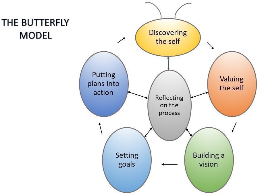 Bu program, öğrencilerin dil öğrenme deneyimlerini ve öz-yönetim becerilerini geliştirmeyi amaçlayan bir danışmanlık programını temel almaktadır. Temel alınan model, Self-Determination Theory (SDT) (Ryan & Deci, 2000) ve PERMA Model (Seligman, 2012) dayandığı Butterfly Model'dir (Güven Yalcin, 2023) (Şekil 2). Bu model, öğrencilerin öz farkındalık, özgüven ve motivasyonlarını geliştirmeyi hedeflemektedir. Ayrıca, model Türkçe bağlamında öğrenen özerkliği üzerine yapılan çalışmalarla uyumlu olacak şekilde geliştirilmiştir.