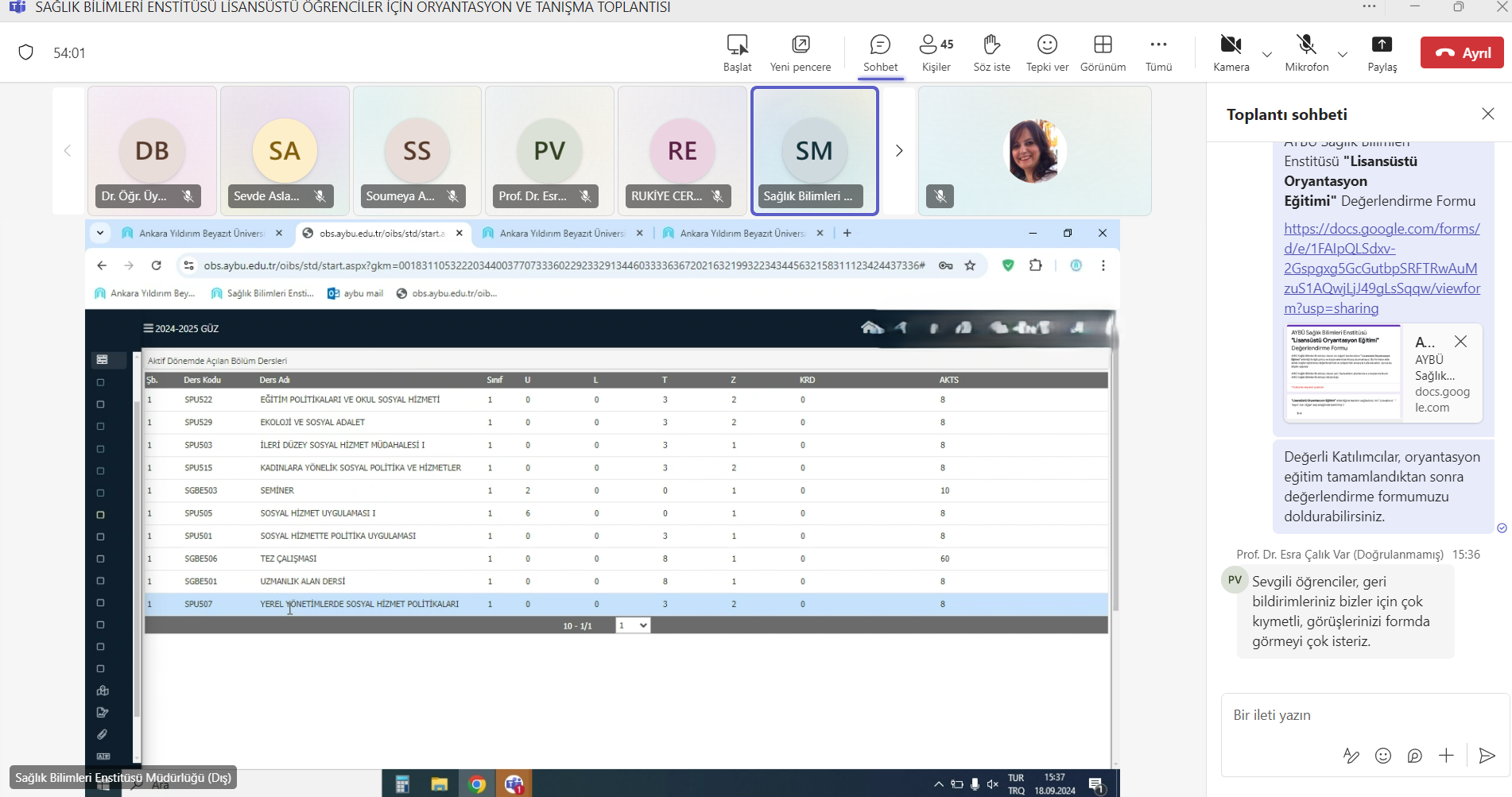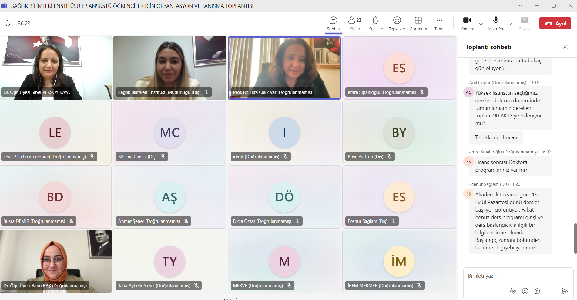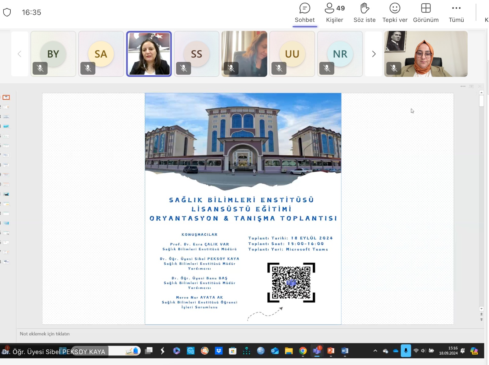 Ankara Yıldırım Beyazıt Üniversitesi Sağlık Bilimleri Enstitü Müdürlüğümüz bünyesinde eğitim öğretim faaliyetlerini sürdüren lisansüstü programlarımızda eğitim-öğretimine devam eden ve 2024-2025 Eğitim-Öğretim Yılı Güz Dönemi itibariyle Enstitümüz ailesine yeni katılan değerli tüm öğrencilerimize 18.09.2024 tarihinde Enstitü Müdürümüz Sayın Prof. Dr. Esra ÇALIK VAR başkanlığında Çevrimiçi (Online) Oryantasyon Eğitimi ve Tanışma Programı gerçekleştirilmiştir.