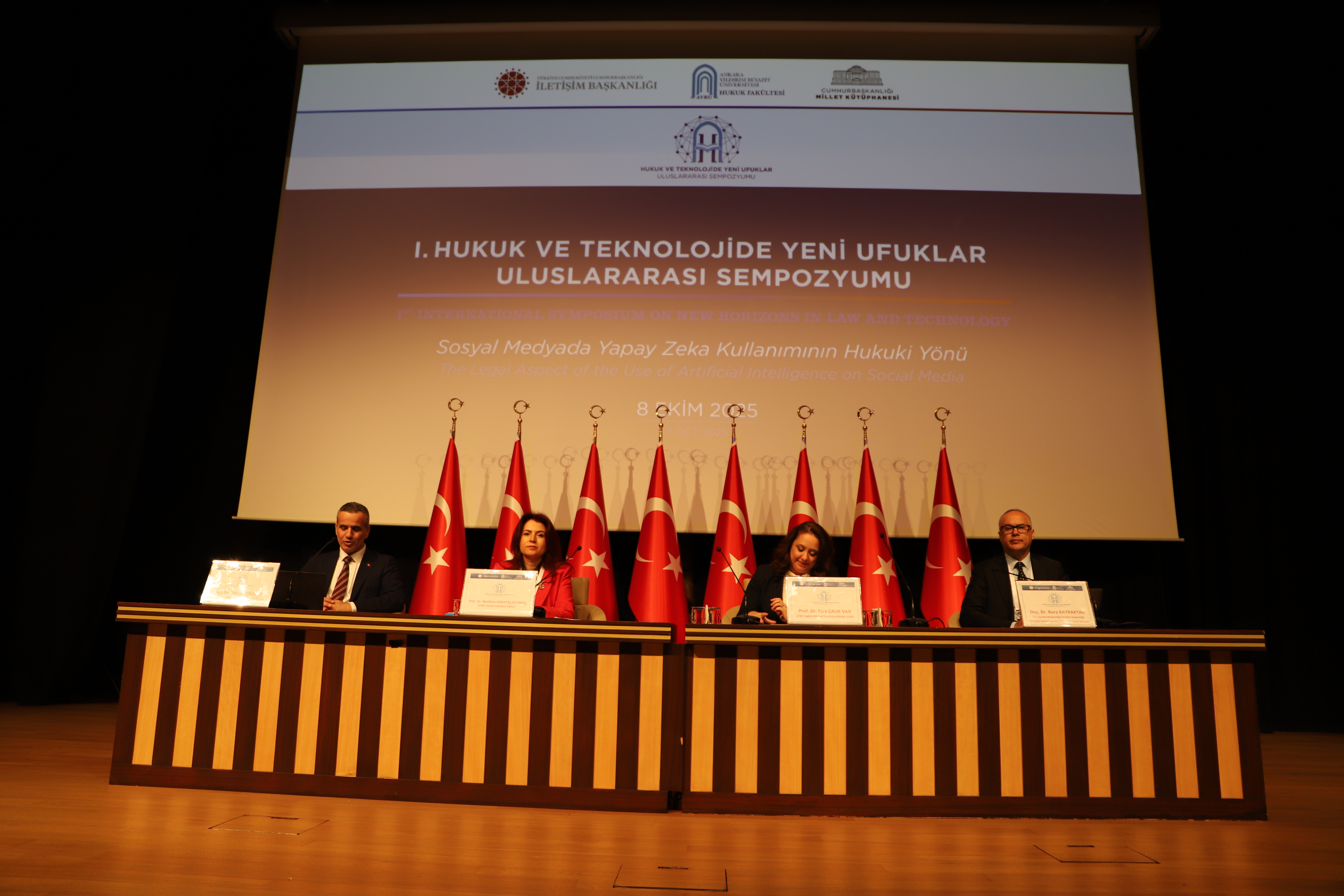 Ankara Yıldırım Beyazıt Üniversitesi (AYBÜ) Hukuk Fakültesi tarafından teknolojideki gelişmelerin hukuki yönleriyle ele alındığı "I. Hukuk ve Teknolojide Yeni Ufuklar Uluslararası Sempozyumu" düzenlendi. Cumhurbaşkanlığı İletişim Başkanlığı işbirliğiyle, "Sosyal Medyada Yapay Zeka Kullanımının Hukuki Yönü" konu başlığıyla düzenlenen sempozyum, Enstitü Müdürümüz Sayın Prof. Dr. Esra ÇALIK VAR’ın katılımıyla Cumhurbaşkanlığı Millet Kütüphanesi'nde gerçekleştirildi.