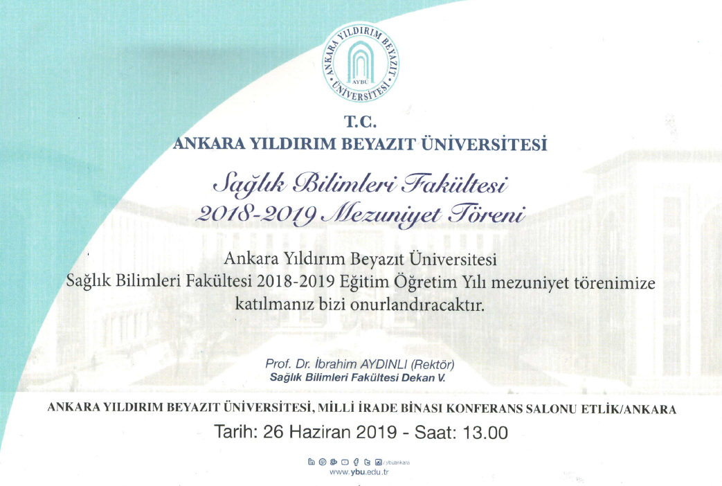 Fakültemizin 26 Haziran 2019 saat 13.00 da gerçekleşecek olan 2018-2019 Eğitim-Öğretim yılı Mezuniyet Töreninde sizleri de aramızda görmekten onur duyarız.