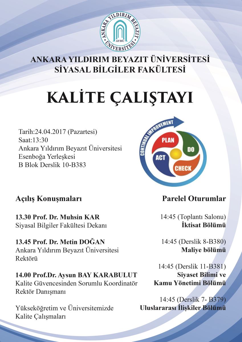 Rektörümüz Prof. Dr. Metin DOĞAN, Kalite Güvencesinde Sorumlu Koordinatör Prof. Dr. Aysun BAY KARABULUT, Öğretim Elemanlarımız, İdari Personelimiz ve öğrencilerimizin katılacağı Siyasal Bilgiler Fakültesi Kalite Çalıştayı yapılacaktır.
