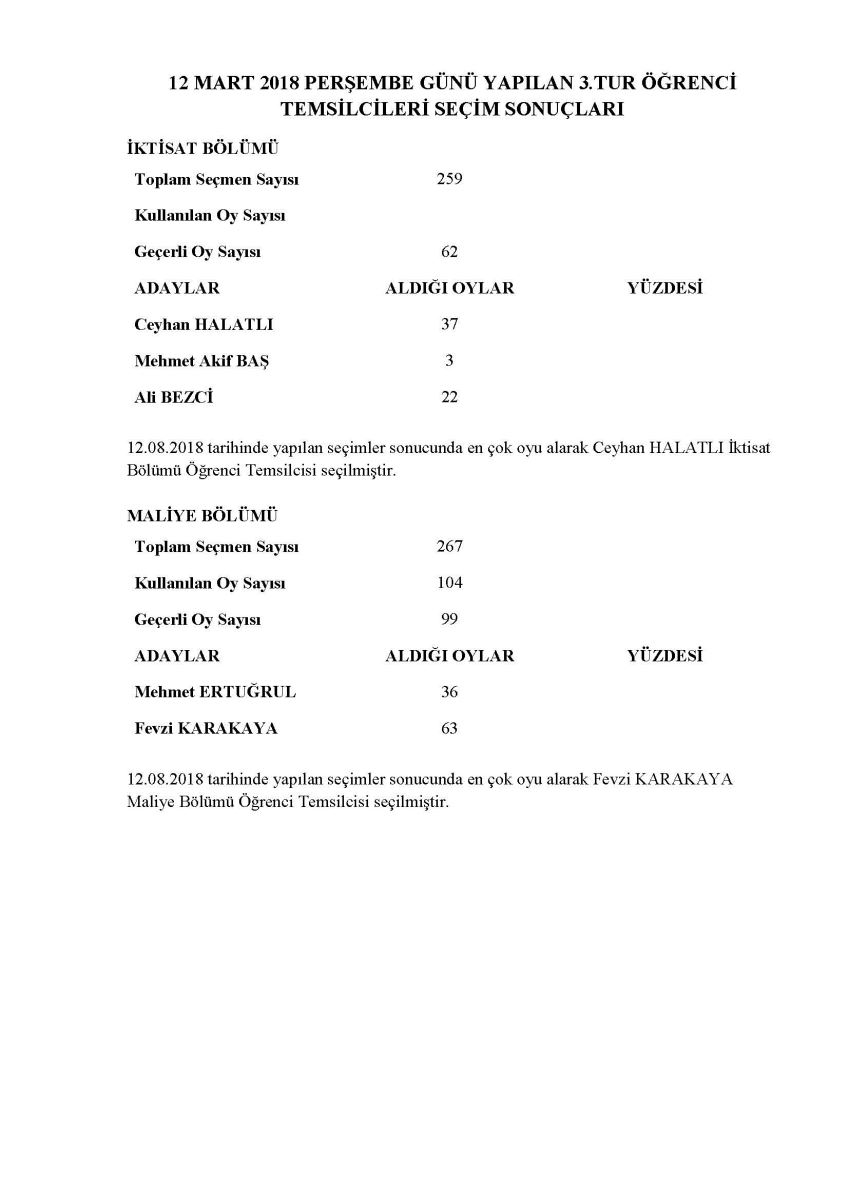 12 MART 2018 PERŞEMBE GÜNÜ YAPILAN 3.TUR ÖĞRENCİ TEMSİLCİLERİ SEÇİM SONUÇLARI