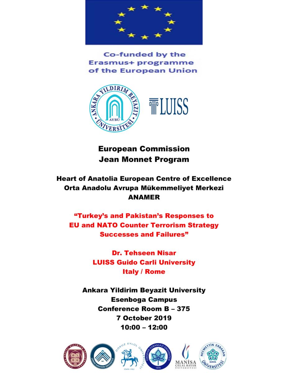 Pazartesi günü Dr. Öğr. Üyesi Merve Seren Hocamızın dersinde Italya LUISS Guido Carli Üniversitesi'nden Dr. Tehseen Nisar "Turkey’s and Pakistan’s Responses to EU and NATO Counter Terrorism Strategy Successes and Failures" başlıklı sunumu gerçekleştirilecektir.