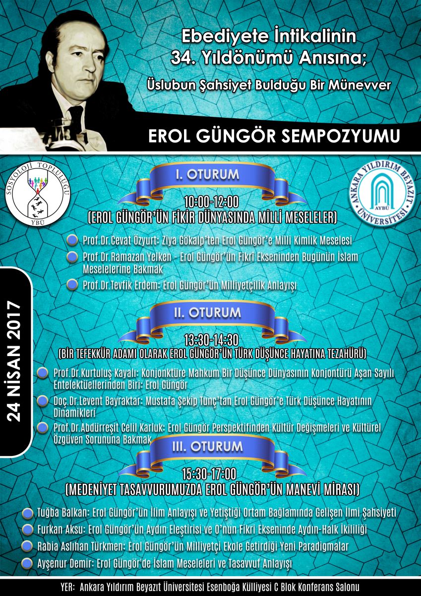 İnsan ve Toplum Bilimleri Fakültesi Sosyoloji Bölümü ile Sosyoloji Topluluğu tarafından merhum düşünür Erol Güngör anısına 24 Nisan 2017 tarihinde sempozyum düzenlenecektir. Bu sempozyumda Erol Güngör'ün fikir hayatını ele alan önemli bildiriler sunulacaktır. Üniversitemiz akademisyenlerinin yanı sıra Prof. Dr. Kurtuluş Kayalı, Prof. Dr. Tevfik Erdem, Erol Güngör’ün öğrenciliğini yapmış olan Prof. Dr. Vedat Bilgin ve Prof. Dr. Mehmet Naci Bostancı programda konuşmacı olarak yer alacaktır. Katılımcılar ve programımız aşağıda bulunmaktadır. Sempozyuma öğretim elemanları ve öğrencilerimizin başta olmak üzere tüm ilgilileri bekleriz.