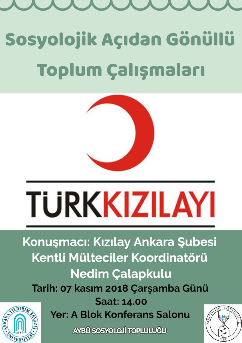 AYBÜ Sosyoloji Bölümü ve Sosyoloji Topluluğu'nun misafirliğinde Esenboğa Külliyesi'nde "Sosyolojik Açıdan Gönüllü Toplum Çalışmaları" adlı konferans gerçekleştirilecektir. Kızılay Ankara Şubesi Kentli Mülteciler Koordniatörü Nedim Çalapkulu'nun konuşmacı olarak katılacağı konferans 07 Kasım Çarşamba günü saat 14.00'da A Blok Konferans Salonu'nda yapılacaktır. Toplantıya katılım tüm ilgililere açıktır.