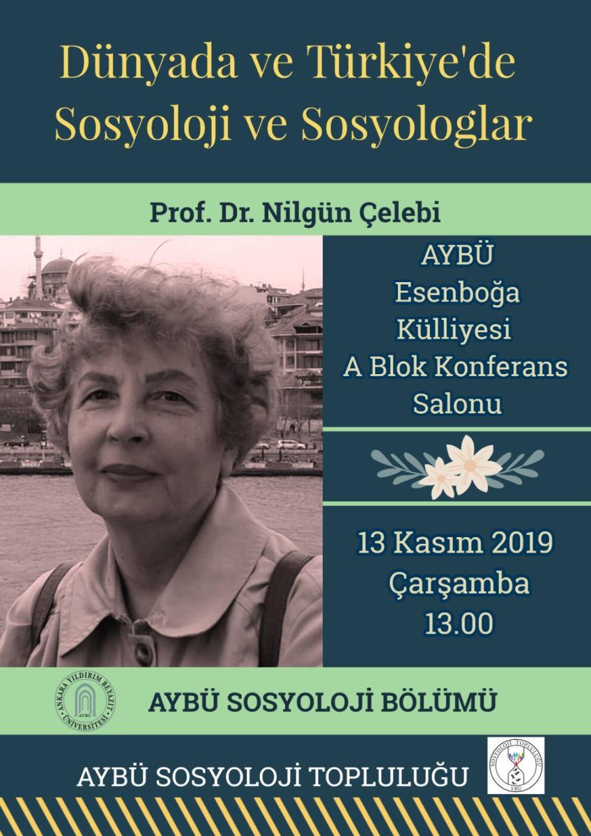 13 Kasım 2019 tarihinde fakültemizde sosyolog Prof. Dr. Nilgün Çelebi'yi ağırlayacağız. Yıllarca Ankara Üniversitesi DTCF Sosyoloji Bölümü'nde çalışıp Muğla Üniversitesi Sosyoloji Bölümü'nden emekli olan sayın Çelebi bizlere dünyada ve Türkiye'de sosyoloji dsiplinine dair genel görüşlerini aktaracak. Çarşamba günü saat 13.00'da Esenboğa Külliyesi A Blok zemin katta bulunan Konferans Salonu'nda gerçekleştirilecek etkinliğe katılım herkese açıktır.