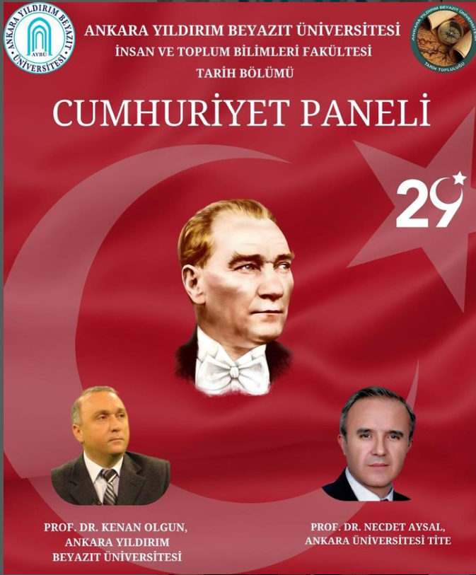 Ankara Yıldırım Beyazıt Üniversitesi Tarih Topluluğu olarak Cumhuriyetimizin 101. yıl dönümüne özel düzenlediğimiz, Prof. Dr. Kenan Olgun ve Prof. Dr. Necdet Aysal'ın katılımlarıyla 30 Ekim 2024 Çarşamba 13.00'da Esenboğa Külliyesi A Blok Konferans Salonu'nda gerçekleşecek olan 'Cumhuriyet Paneli'ne davetlisiniz. Cumhuriyetimizin 101. yılını beraber kutlayalım.