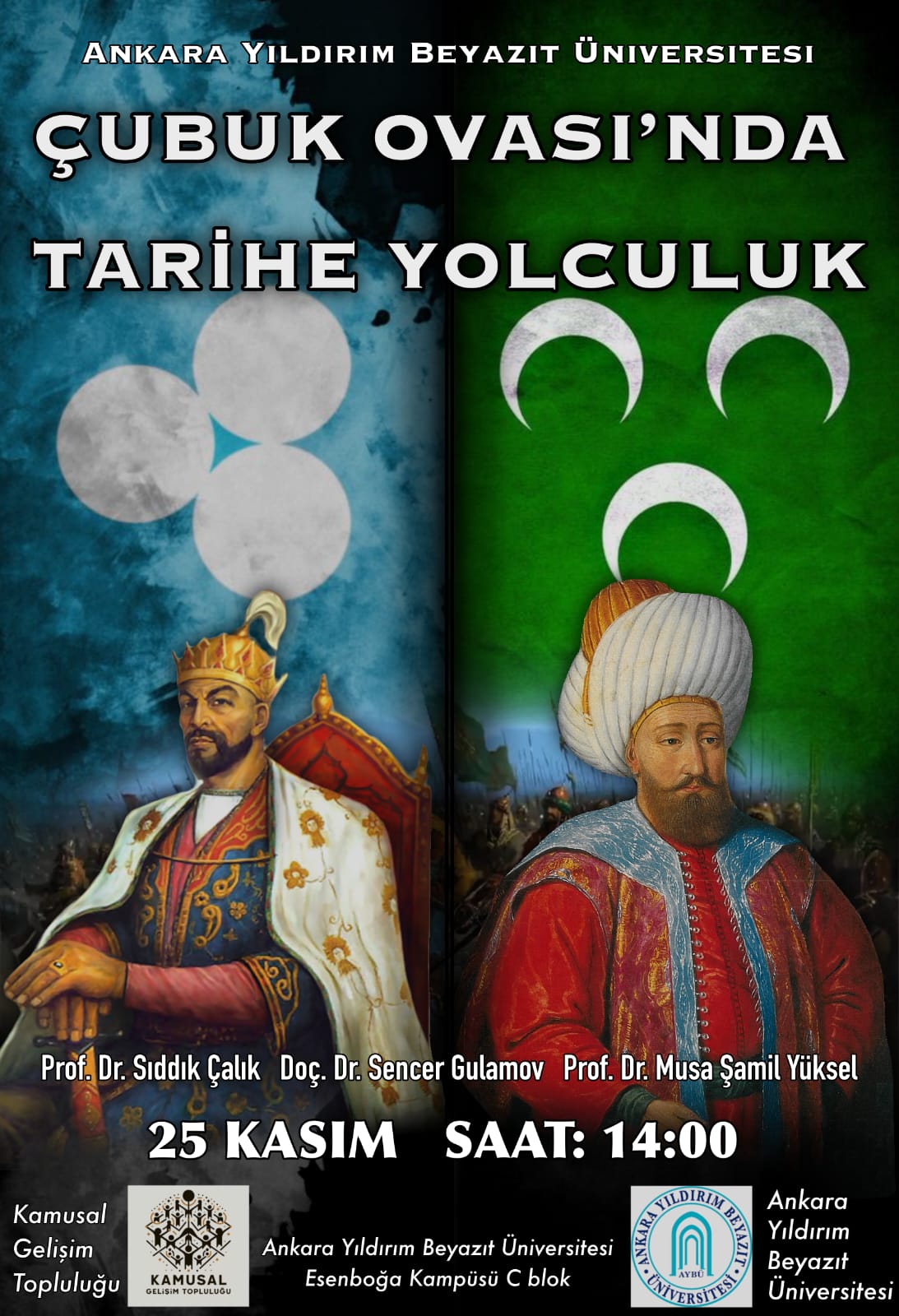 Çubuk Ovası’nda Tarihe Yolculuk: Alanında uzman hocalarımız Prof. Dr. Musa Şamil Yüksel, Prof. Dr. Sıddık Çalık ve Özbekistan’dan Prof. Dr. Sencer Gulamov hocalarımızın katılımıyla üniversitemize adını veren Yıldırım Beyazıt ve Timurlu İmparatorluğu'nun Emiri Timur arasında yaşanan ve 11 yıl sürecek olan Fetret Devri’nin başlamasına neden olan “Ankara Savaşı” konulu açık oturumumuz 25 Kasım saat: 14.00’da Esenboğa Kampüsü C blok konferans salonunda başlayacaktır.