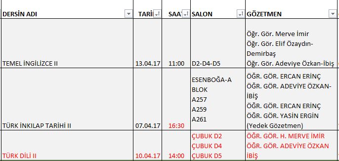 2016-2017 Bahar Dönemi ING102,TDL102 ve TİT102 Kodlu Derslerin Vize Sınav Tarihleri (04.04.2017)
