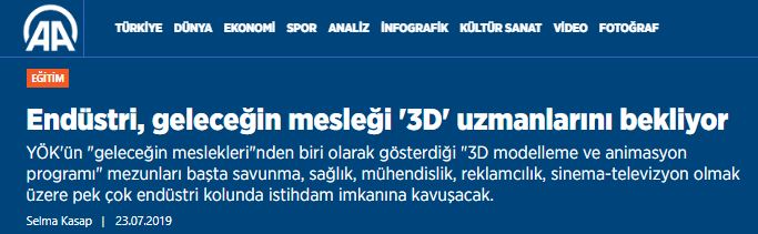 Meslek Yüksekokulu Müdürümüz Prof. Dr. Aytunç Ateş Anadolu Ajansı'na  YÖK'ün "geleceğin meslekleri"nden biri olarak gösterdiği "3D modelleme ve animasyon programı" hakkında açıklamalarda bulundu.